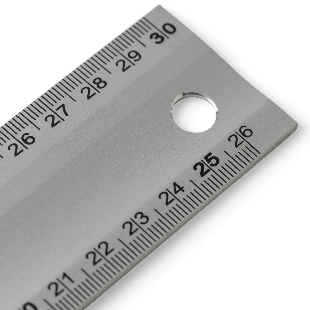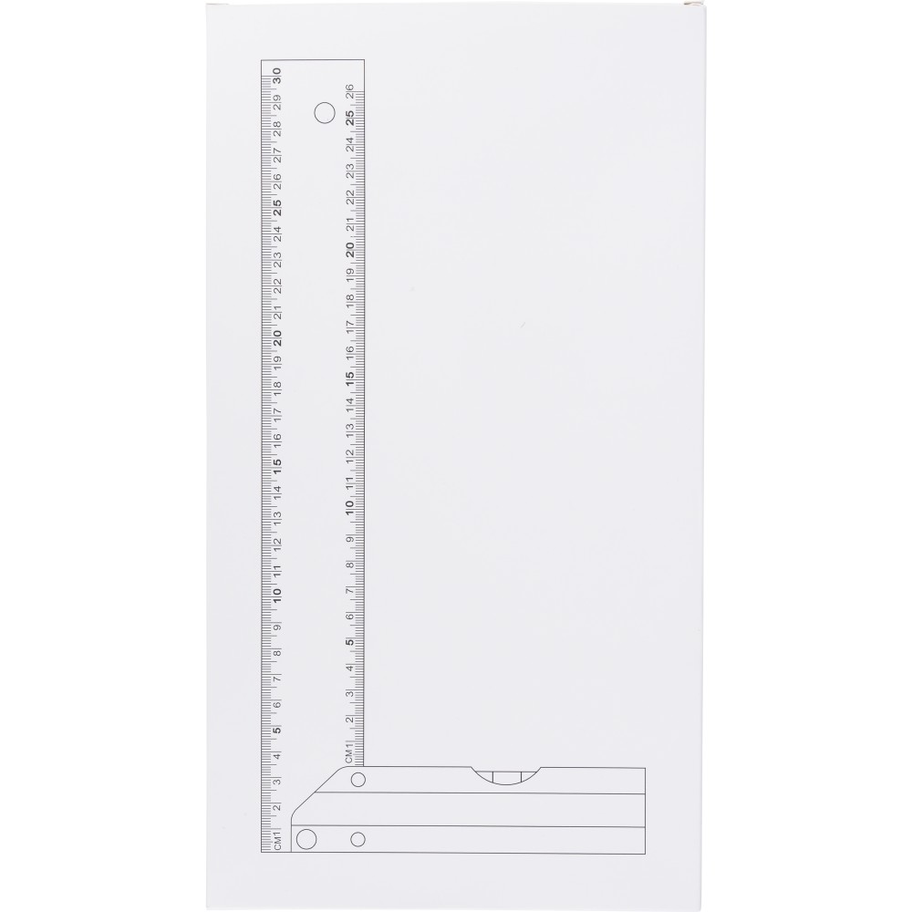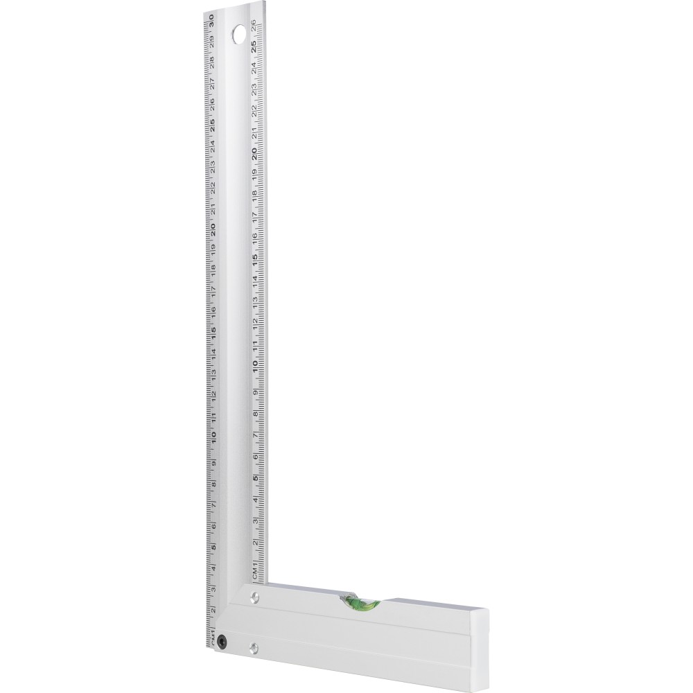Aluminium set square with integrated spirit level. Length 30 cm with clear indication in centimeters. Practical design for precise measuring and leveling. Packed individually in a brown carton box with illustration.