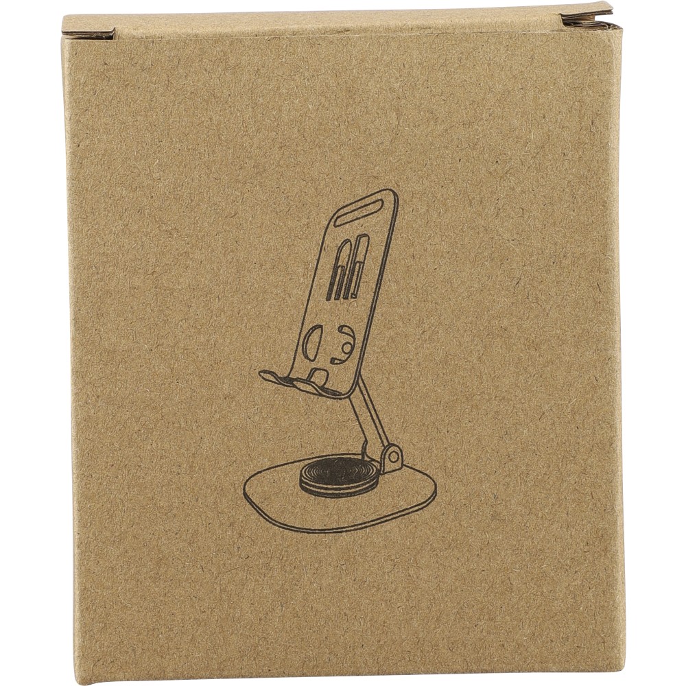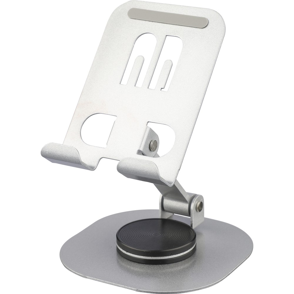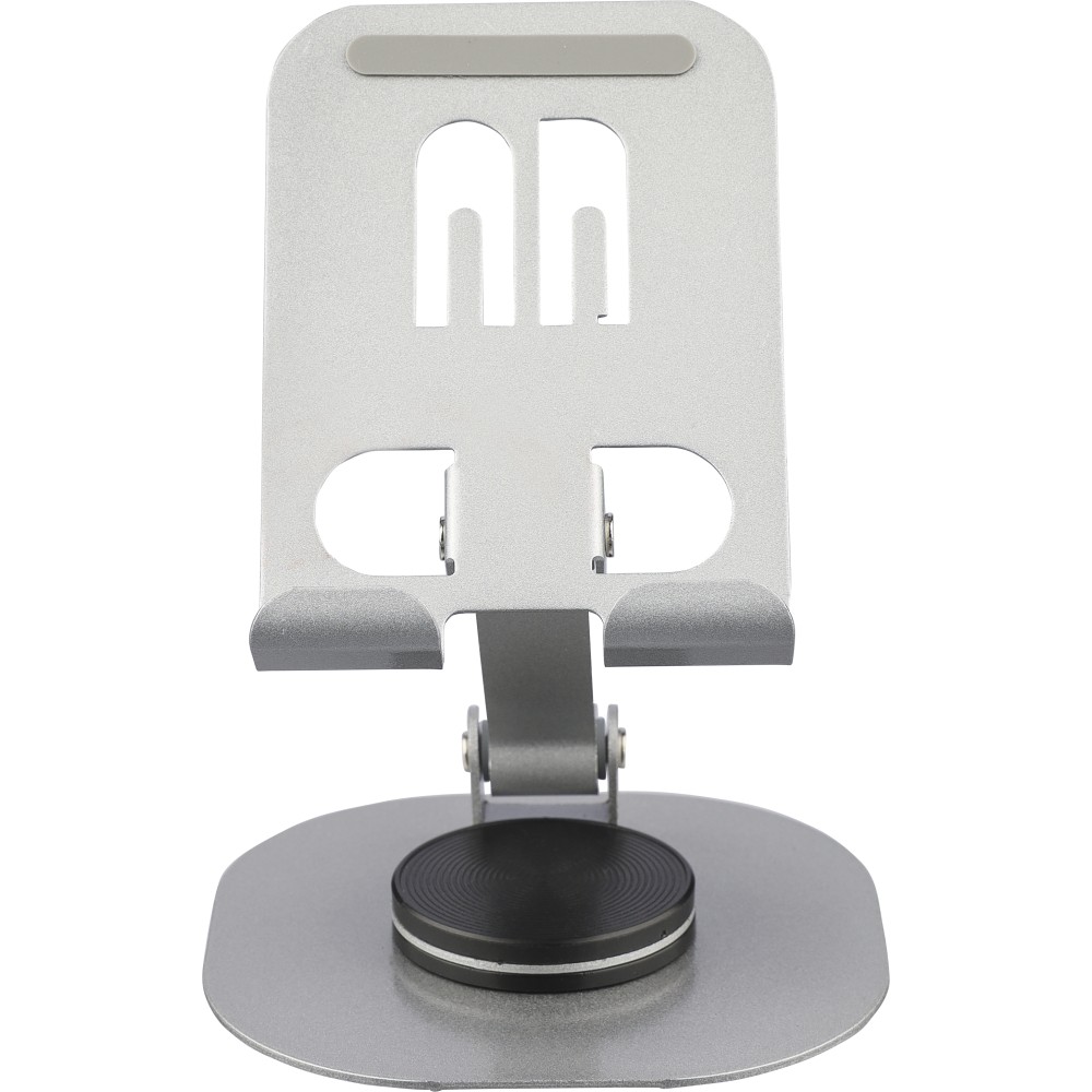 Aluminium alloy phone stand with 360-degree rotation function. Can be fully folded flat for easy storage. Sturdy and weighty design for stable support. Individually packaged in a white box.