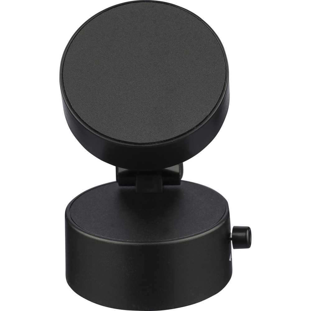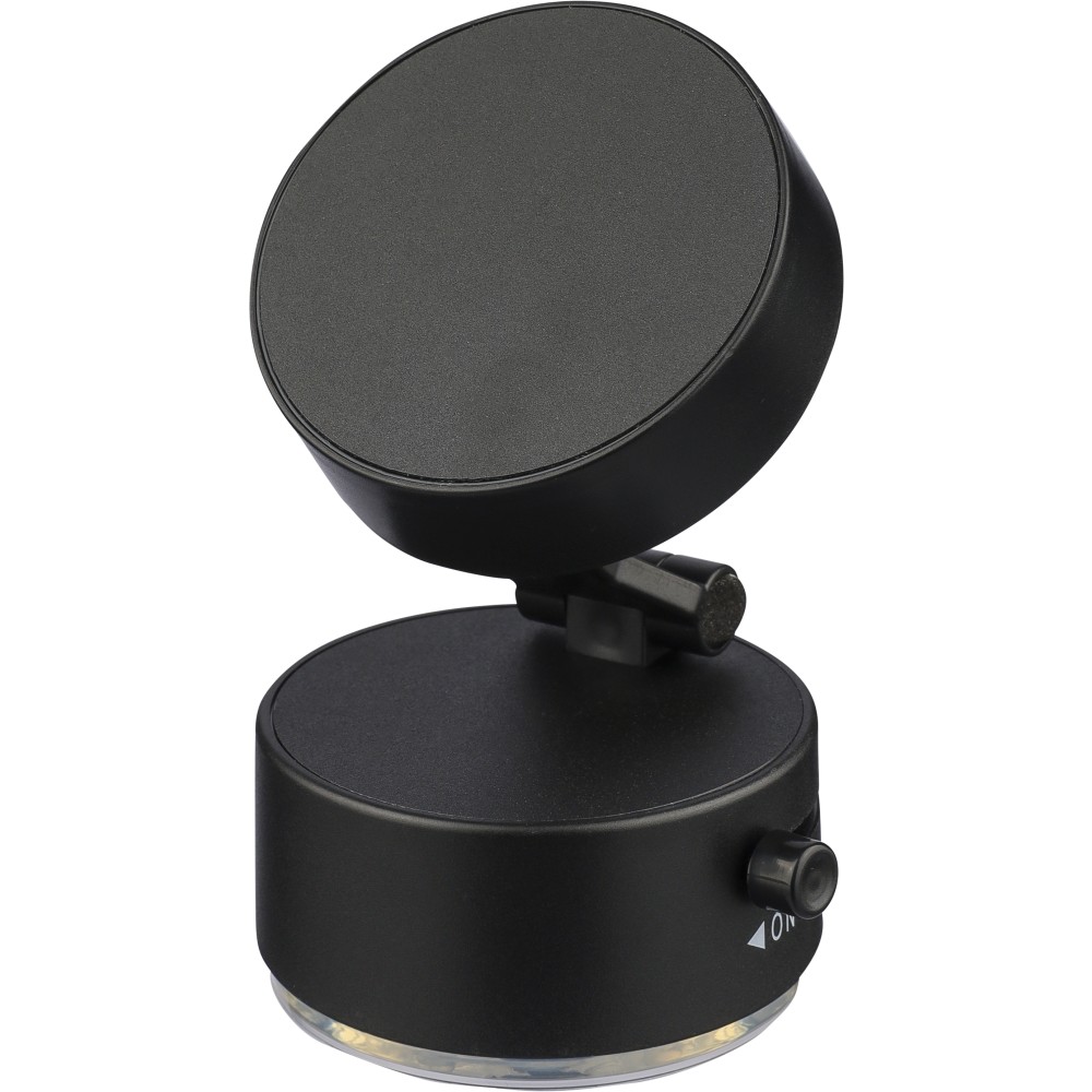 Recycled ABS MagSafe phone stand with suction cup base and lock function for secure use on smooth surfaces. Foldable design with metal ring for universal phone compatibility. Recycled logo between on/off. Packed in a brown cardboard box.