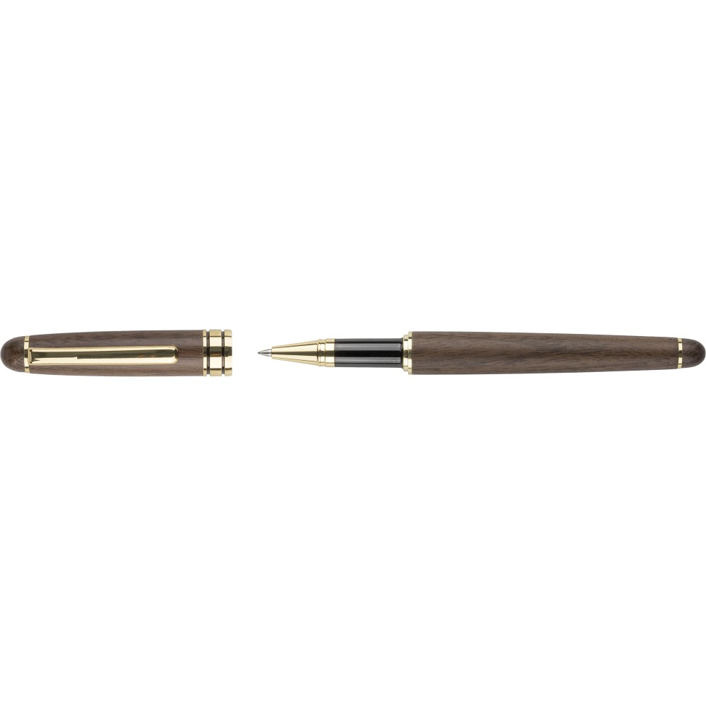 Walnut wood and brass pen set with twist ballpen (approx. 1,000 meters) and rollerball (up to 400 meters), both with blue German Dokumental ink. Ballpen features metal tip, clip, and trim. Packaged in maple wooden box and brown cardboard box.
