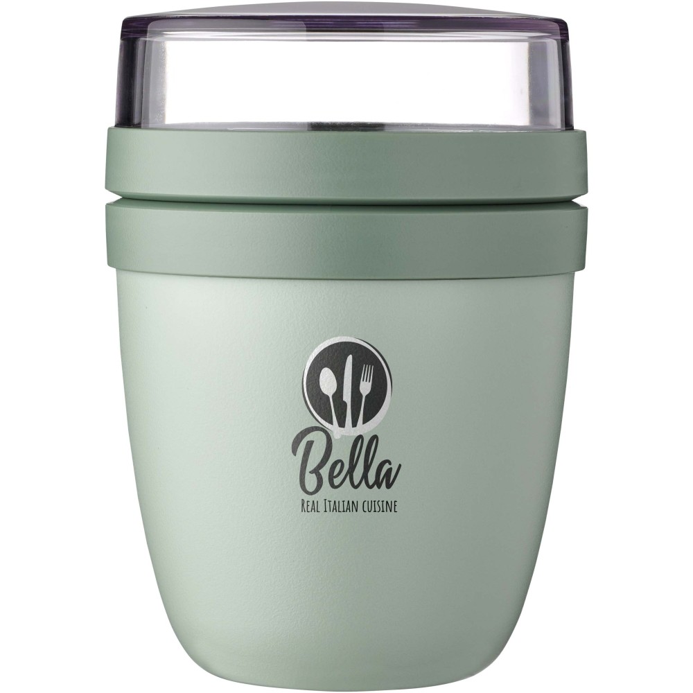 The Ellipse Mini lunch pot is perfect for a variety of snacks, such as yogurt with muesli or soup with croutons. Featuring two smart compartments in one sturdy container, it keeps your ingredients neatly separated. Its compact size makes it ideal for easily fitting into a school bag for a quick, convenient meal. The top transparent container holds 120 ml, ideal for around 50 grams of muesli or fruit, and the bottom container has a capacity of 300 ml. Leakproof and dishwasher safe. BPA free.