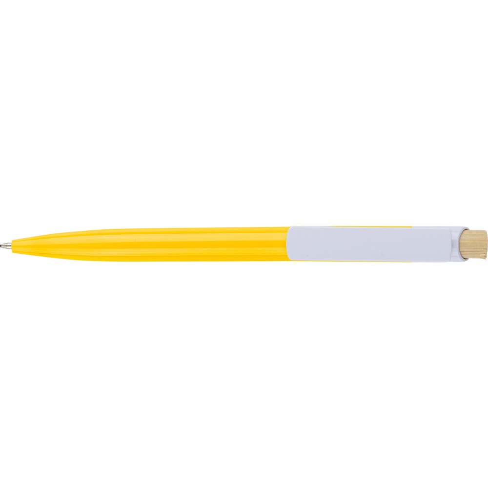 Recycled ABS ballpen with bamboo push button and white clip, suitable for digital printing. Features a recycled logo in the in-mould. Approximate writing length of 600 metres. Blue ink.
