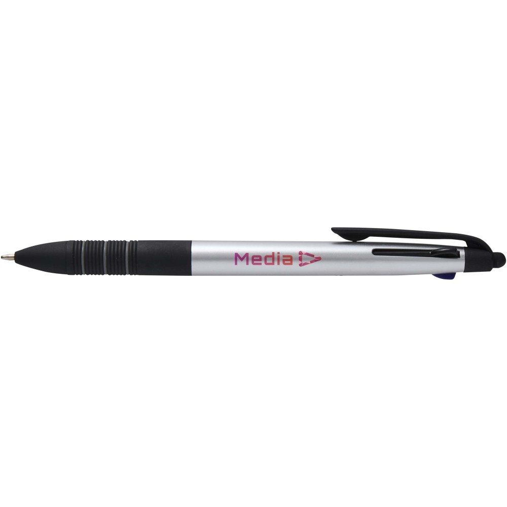 The Trine 3-in-1 ballpoint pen is a versatile writing tool made from RCS certified ABS plastic with a modern metallic finish and an integrated stylus tip for touchscreen use. It features a push-slide mechanism to easily switch between black, blue, and red ink. The ergonomic grip with black anti-slip rubber and grey ring details ensures comfortable handling. Compact, functional, and ideal for branding, the Trine pen is perfect for note-taking, presentations, or digital interactions.