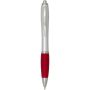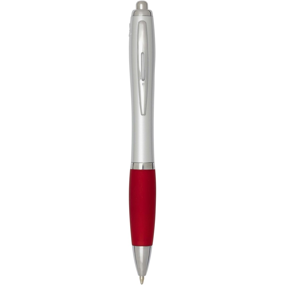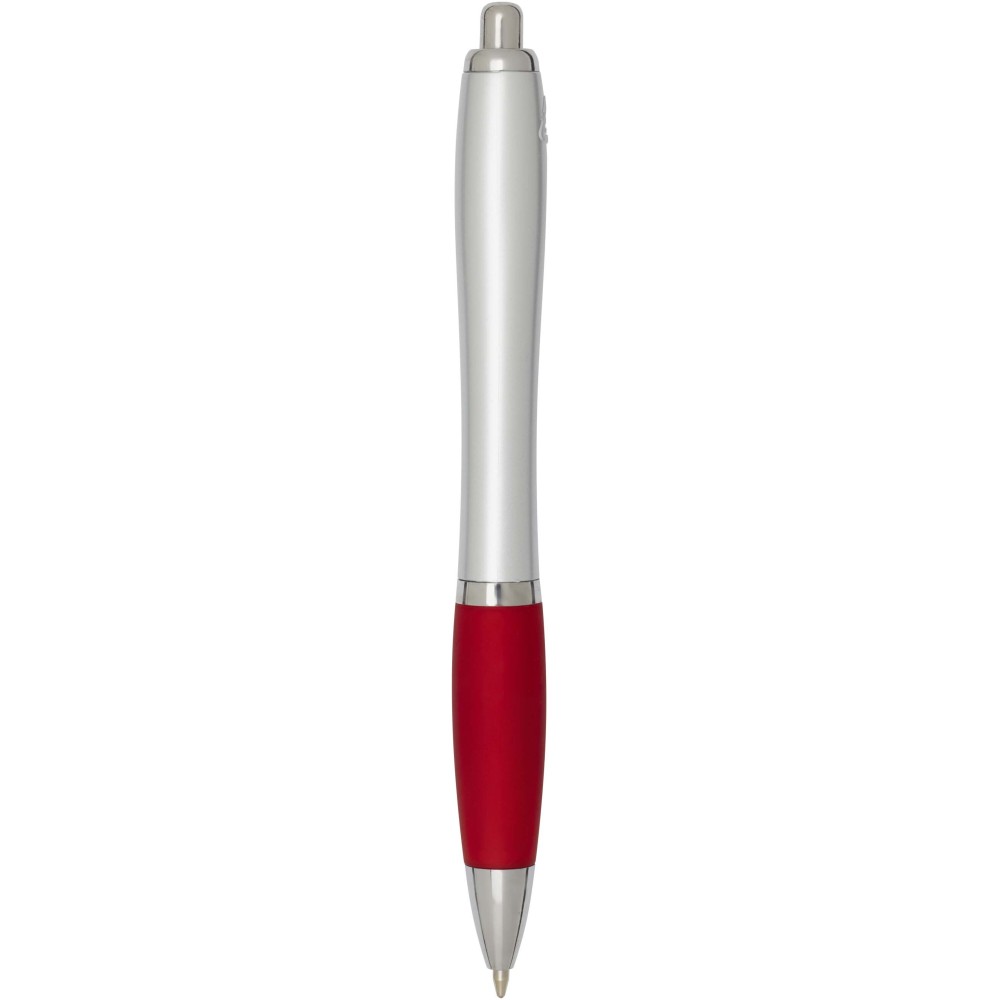 The Nash recycled plastic click-action ballpoint pen features a stylish curvy design with a silver barrel with silver trims and a coloured soft grip for comfortable writing. Made from RCS certified recycled ABS plastic, it helps reduce the use of virgin materials while maintaining durability. A rABS logo is featured on the back, highlighting its recycled content. Ink colour: Black. Nib size: 1.0 mm. Writing length: 1000 metres.
