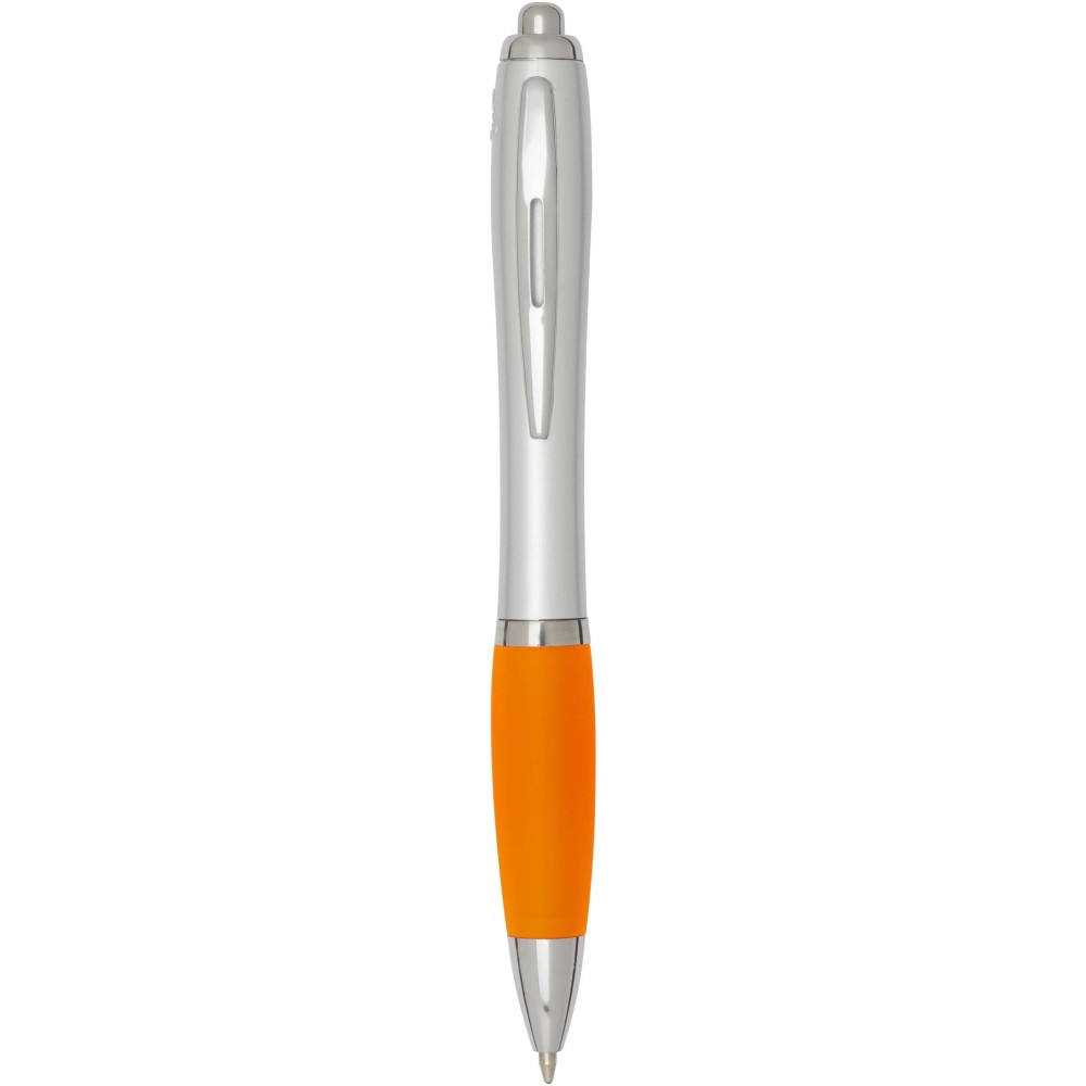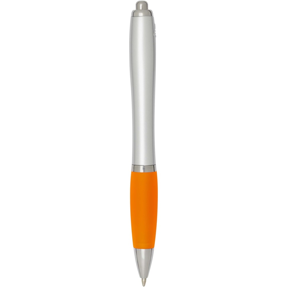 The Nash recycled plastic click-action ballpoint pen features a stylish curvy design with a silver barrel with silver trims and a coloured soft grip for comfortable writing. Made from RCS certified recycled ABS plastic, it helps reduce the use of virgin materials while maintaining durability. A rABS logo is featured on the back, highlighting its recycled content. Ink colour: Black. Nib size: 1.0 mm. Writing length: 1000 metres.