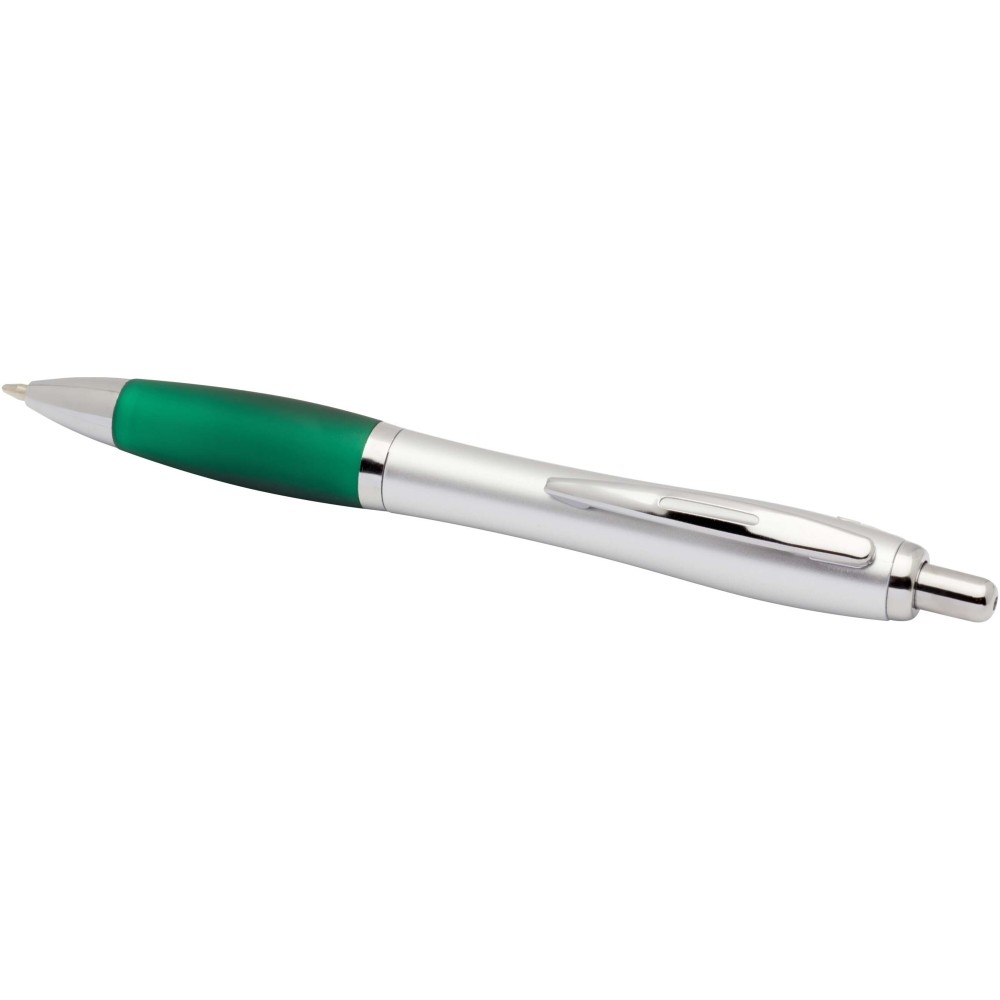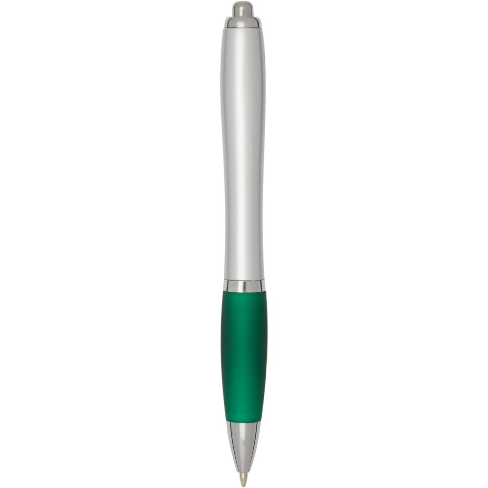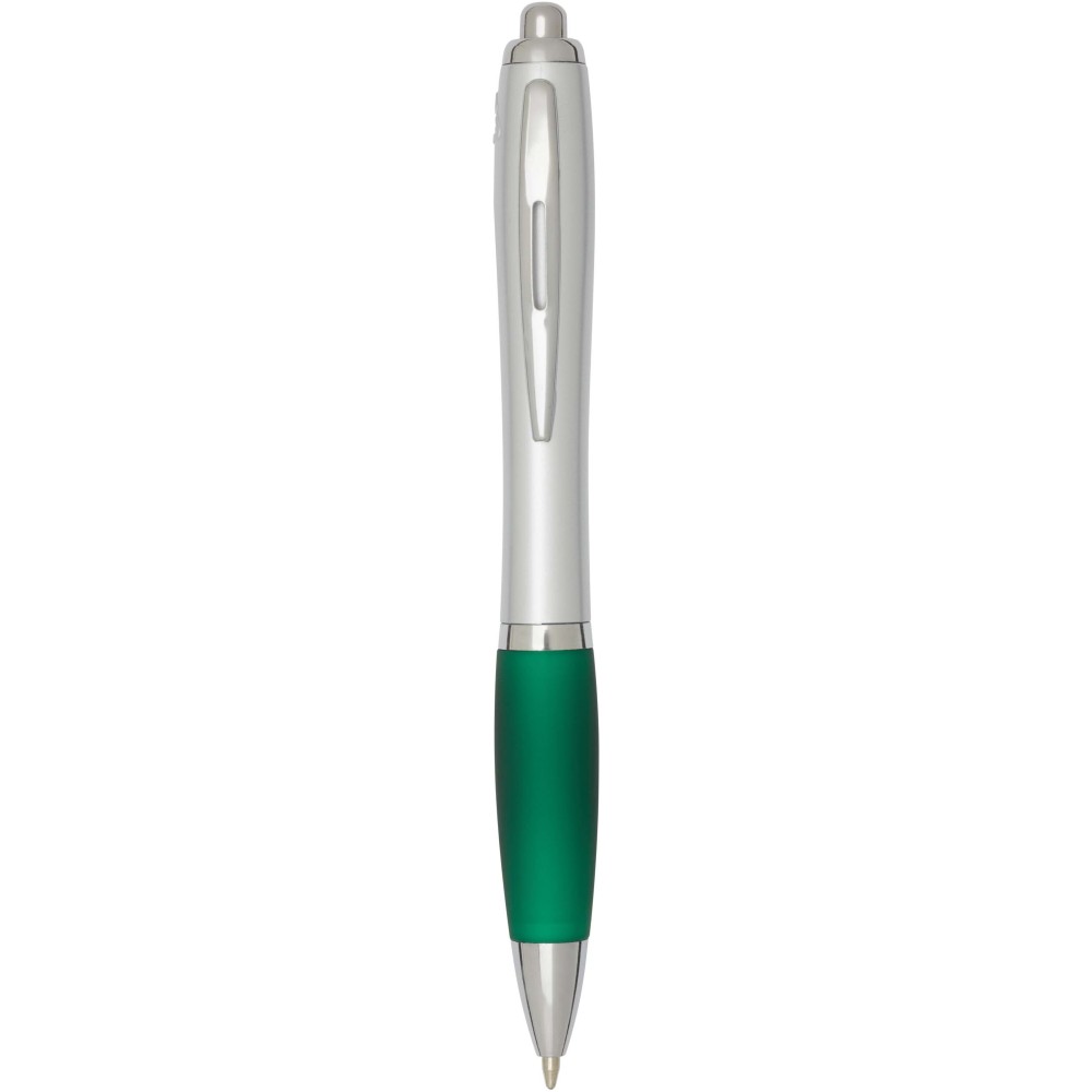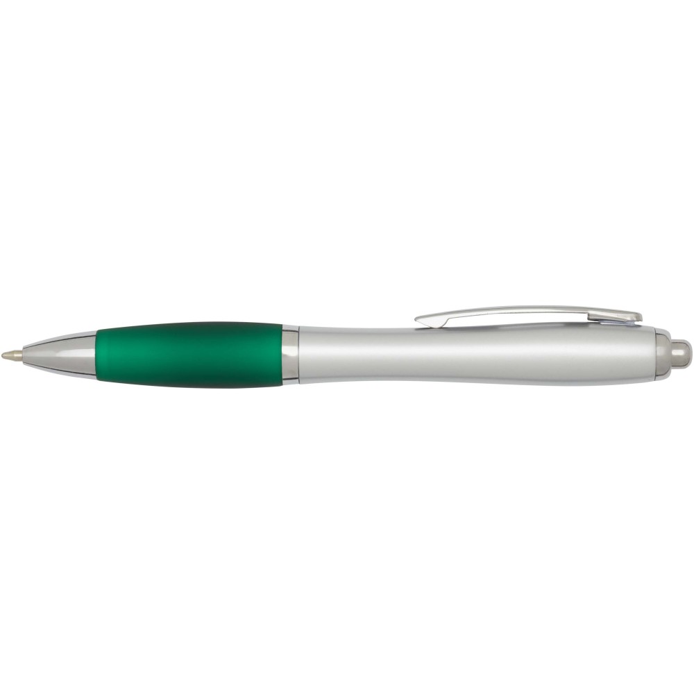 The Nash recycled plastic click-action ballpoint pen features a stylish curvy design with a silver barrel with silver trims and a coloured soft grip for comfortable writing. Made from RCS certified recycled ABS plastic, it helps reduce the use of virgin materials while maintaining durability. A rABS logo is featured on the back, highlighting its recycled content. Ink colour: Black. Nib size: 1.0 mm. Writing length: 1000 metres.