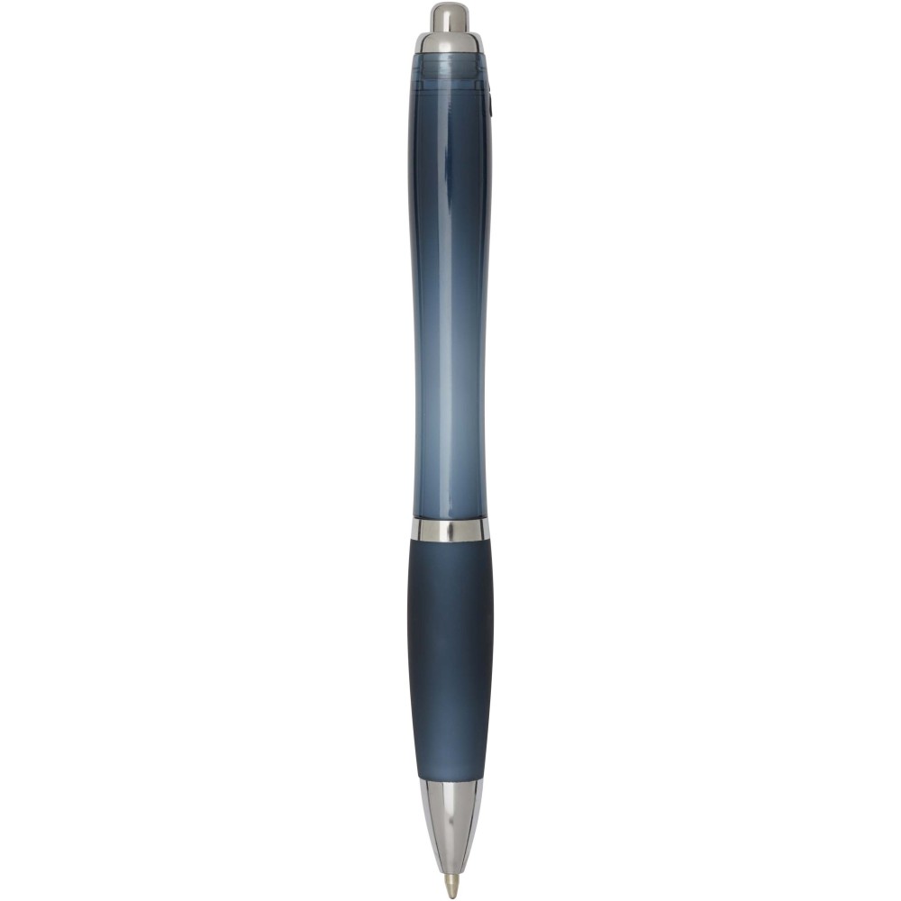 The Nash recycled plastic click-action ballpoint pen features a stylish curvy design with a transparent coloured barrel with silver trims and a matching colour soft grip for comfortable writing. Made from RCS certified recycled ABS plastic, it helps reduce the use of virgin materials while maintaining durability. A rABS logo is featured on the back, highlighting its recycled content. Ink colour: Blue. Nib size: 1.0 mm. Writing length: 1000 metres.