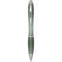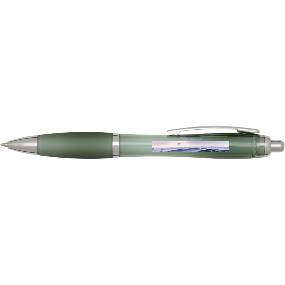 The Nash recycled plastic click-action ballpoint pen features a stylish curvy design with a transparent coloured barrel with silver trims and a matching colour soft grip for comfortable writing. Made from RCS certified recycled ABS plastic, it helps reduce the use of virgin materials while maintaining durability. A rABS logo is featured on the back, highlighting its recycled content. Ink colour: Blue. Nib size: 1.0 mm. Writing length: 1000 metres.