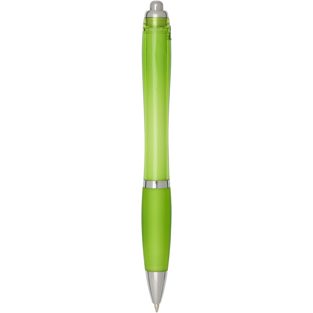 The Nash recycled plastic click-action ballpoint pen features a stylish curvy design with a transparent coloured barrel with silver trims and a matching colour soft grip for comfortable writing. Made from RCS certified recycled ABS plastic, it helps reduce the use of virgin materials while maintaining durability. A rABS logo is featured on the back, highlighting its recycled content. Ink colour: Blue. Nib size: 1.0 mm. Writing length: 1000 metres.