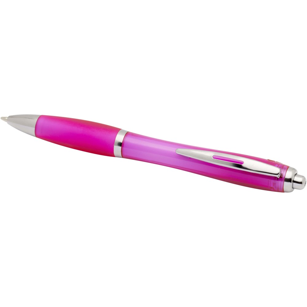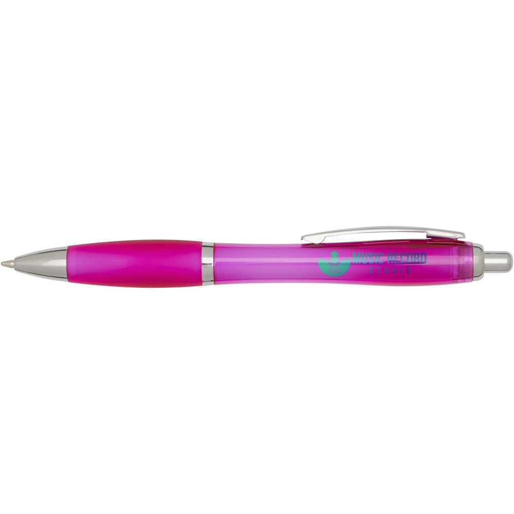 The Nash recycled plastic click-action ballpoint pen features a stylish curvy design with a transparent coloured barrel with silver trims and a matching colour soft grip for comfortable writing. Made from RCS certified recycled ABS plastic, it helps reduce the use of virgin materials while maintaining durability. A rABS logo is featured on the back, highlighting its recycled content. Ink colour: Black. Nib size: 1.0 mm. Writing length: 1000 metres.