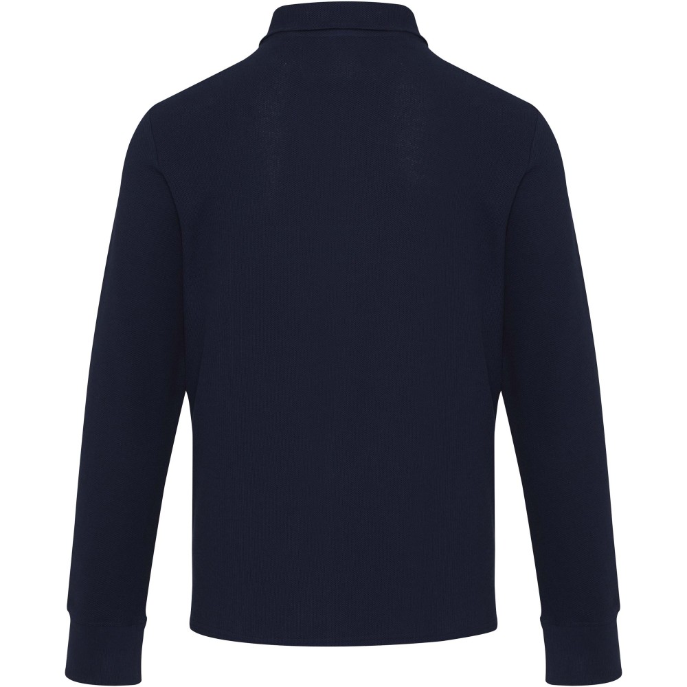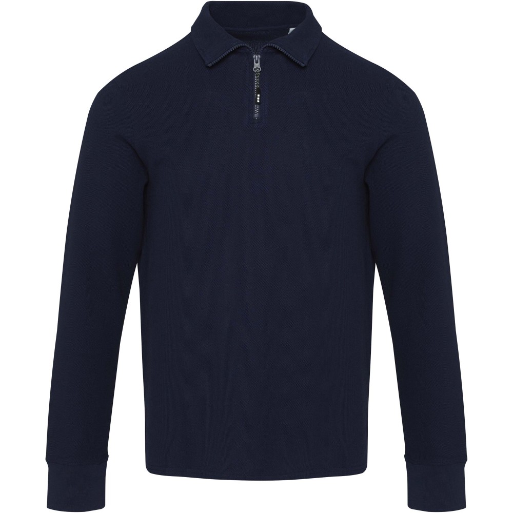 The Zeus unisex long sleeve with half zip is made from 245 g/m2 piqué knit in 100% cotton for year-round wear. It features refined pick-stitch detailing, with self-fabric neck tape for added durability and side slits with self-fabric inserts for enhanced mobility. A heat transfer main label ensures label-free comfort. Equipped with AWARE™ traceability technology, this garment includes a digital product passport for verified transparency and sustainability.