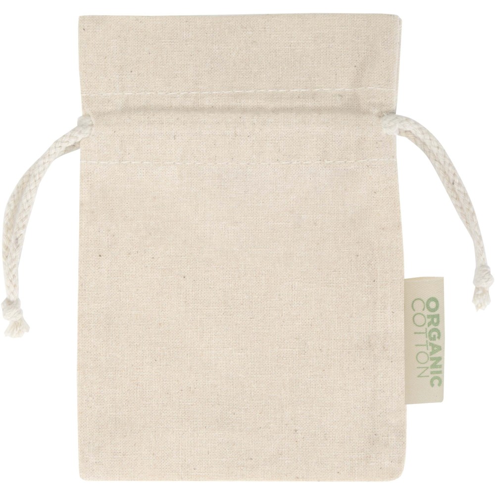 Gift bag made of 100% OCS certified 140 g/m2 organic cotton featuring a cotton drawstring closure. Ideal for gifting or storing items. Size: 15 x 10 cm.
