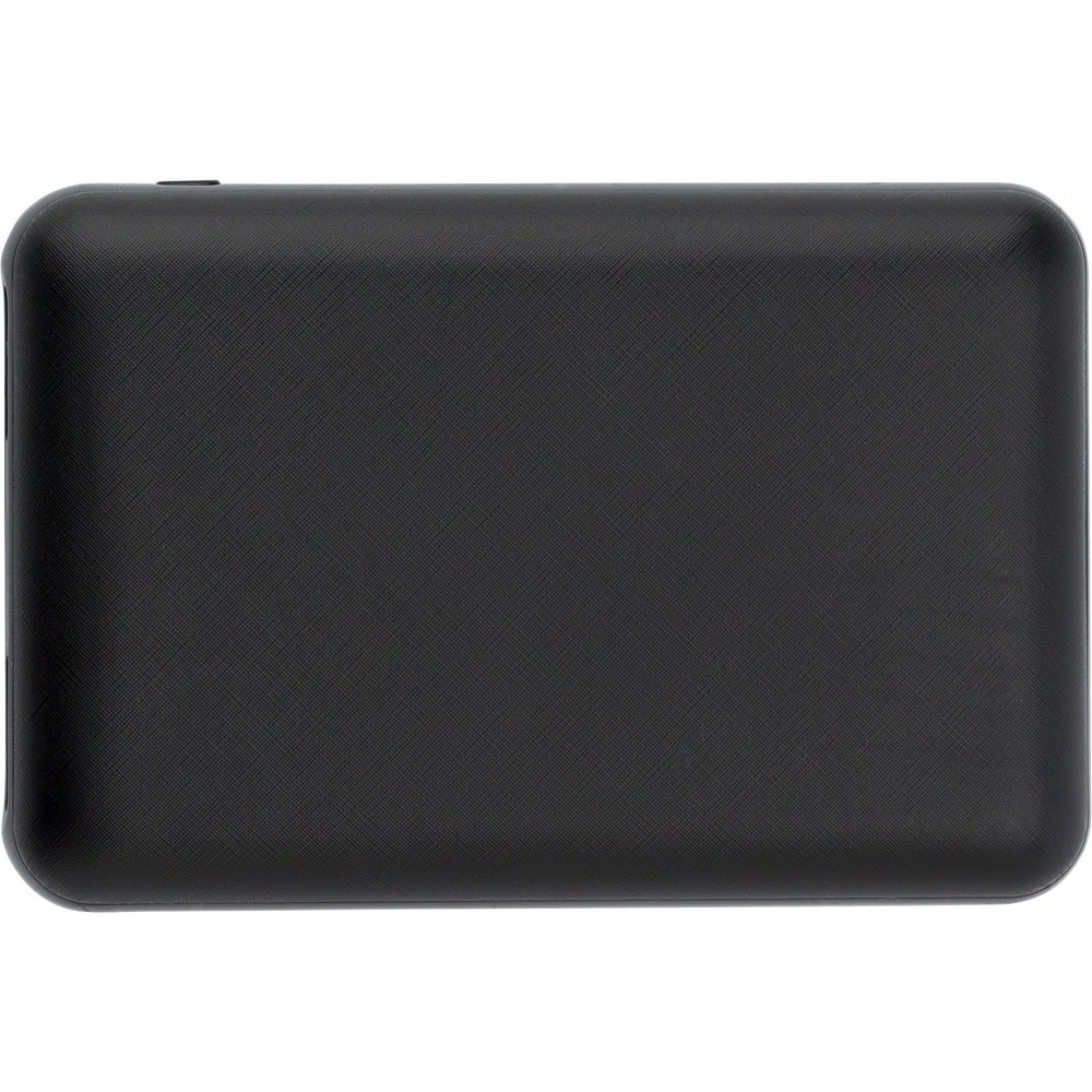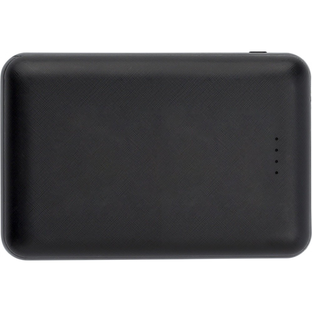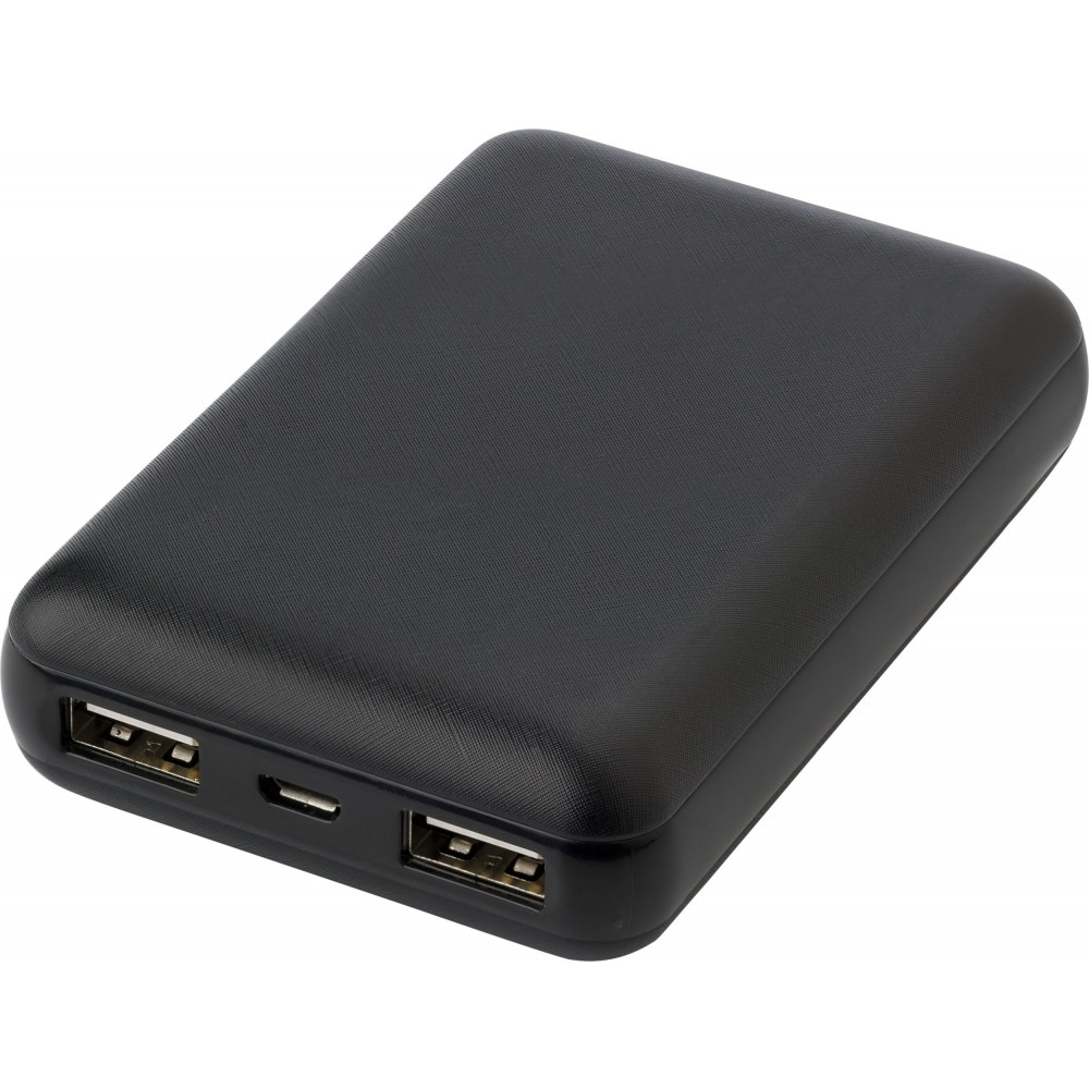 ABS power bank with a capacity of 10.000 mAh. Input DC 5V/1500mA. Output DC 5V/1000mA, 2100mA. LED light indicators. It has two standard USB ports and one micro USB port. Cable included.