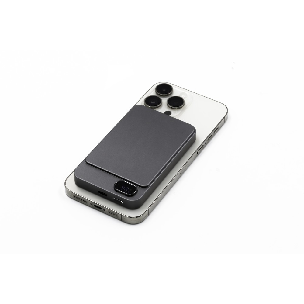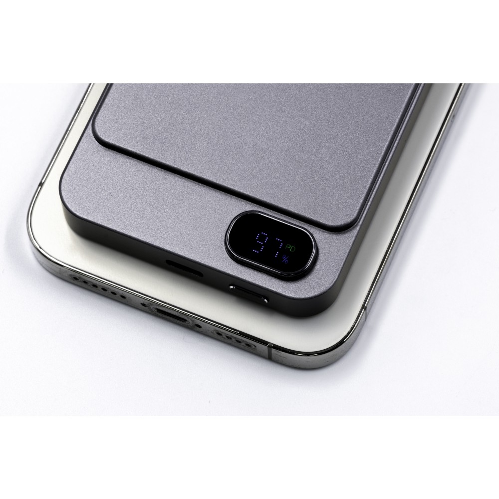 The Powerwave 5000 mAh powerbank features a slim aluminum unibody design that fits easily in any pocket. With a 5,000 mAh capacity, it supports 15W magnetic wireless charging (MagSafe, Qi1 & Qi2) for easy, cable-free charging. It also includes a 20W (PD 3.0) USB-C port to charge laptops or other devices as needed. The LCD display shows battery level and charging status, while a smart chip offers protection from overcurrent, overcharging, overheating, and short-circuiting. Designed with a magnetic snap for quick, secure attachment.