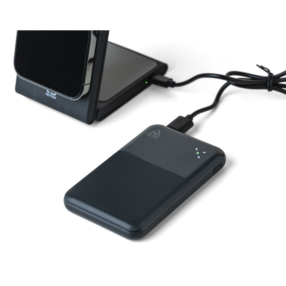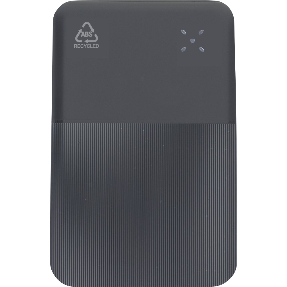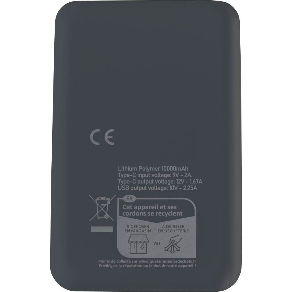 Recycled ABS powerbank (10,000 mAh). 22.5W fast charging. Type-C in/out, Type-A input. Digital display, smooth/textured design. Safety protections. Recycled ABS logo on back. Packed in brown box with tissue paper.