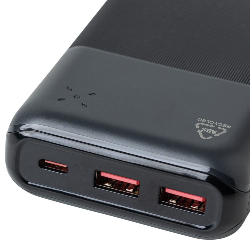 Recycled ABS powerbank (20,000 mAh). 22.5W fast charging. Type-C in/out, Type-A input. LED indicator, safety protections. Recycled ABS logo on back. Packed in brown box with tissue paper.