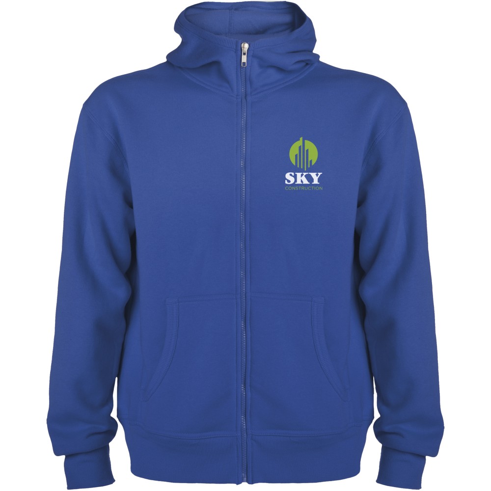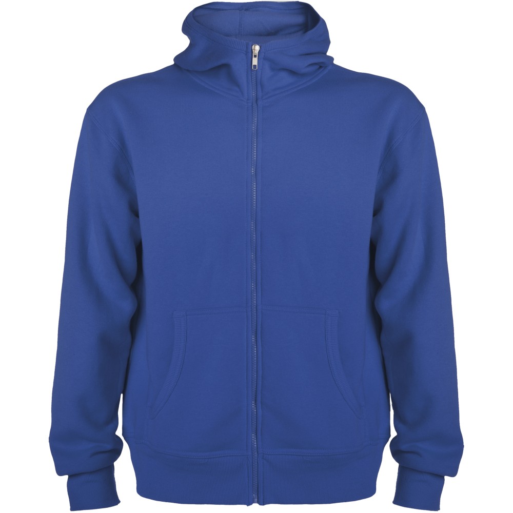 Sweat hooded jacket with high neck and full zip. Ribbed detail in hood and pocket piping. Kangaroo style pocket. 2x2 rib in cuffs and waist. Kids sizes available. Removable label. The model is 184 cm and is wearing size L. Knit of 50% Cotton and 50% Polyester, 280 g/m2.