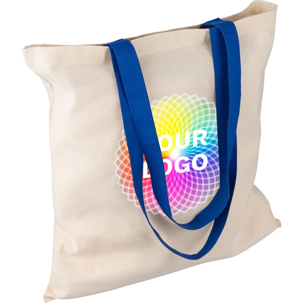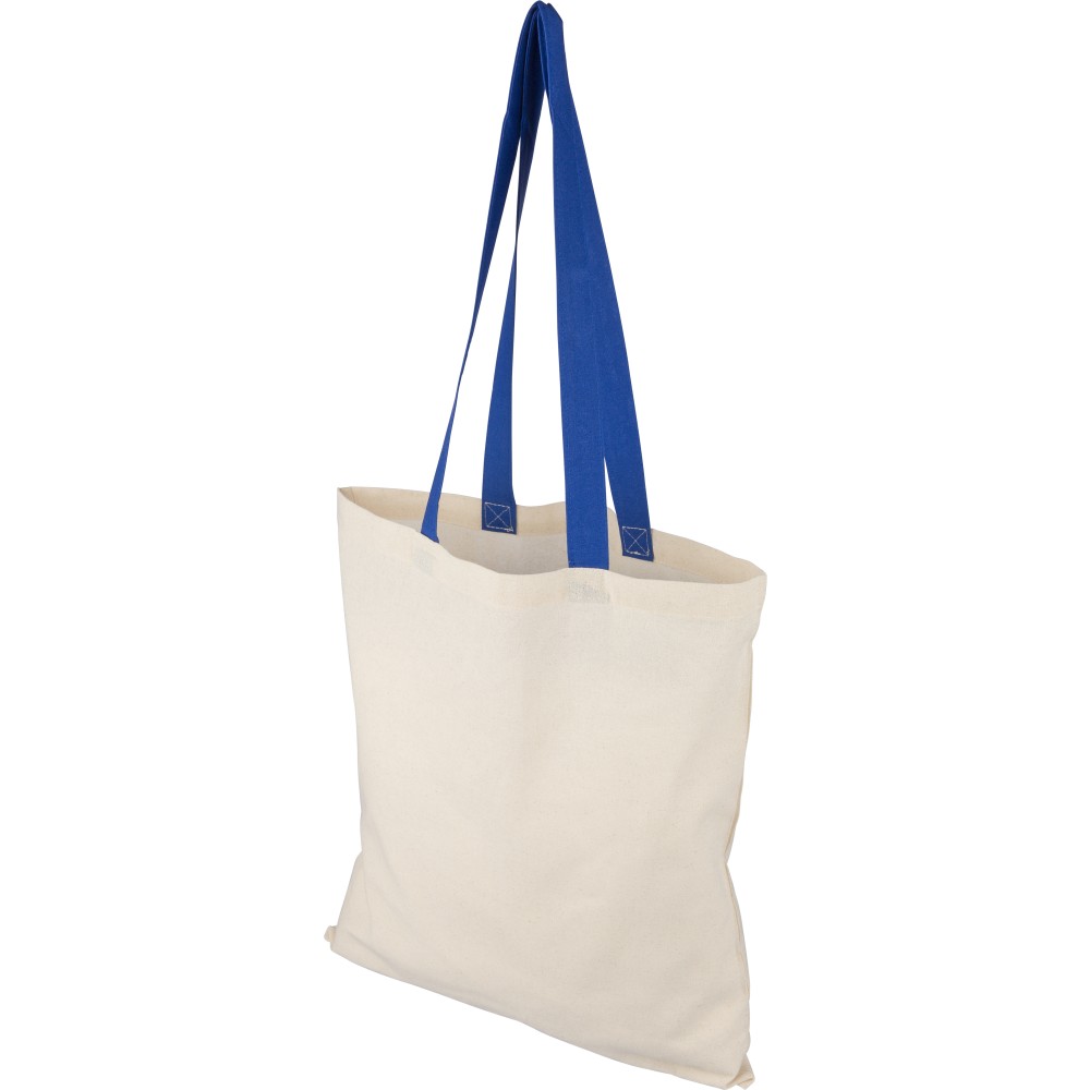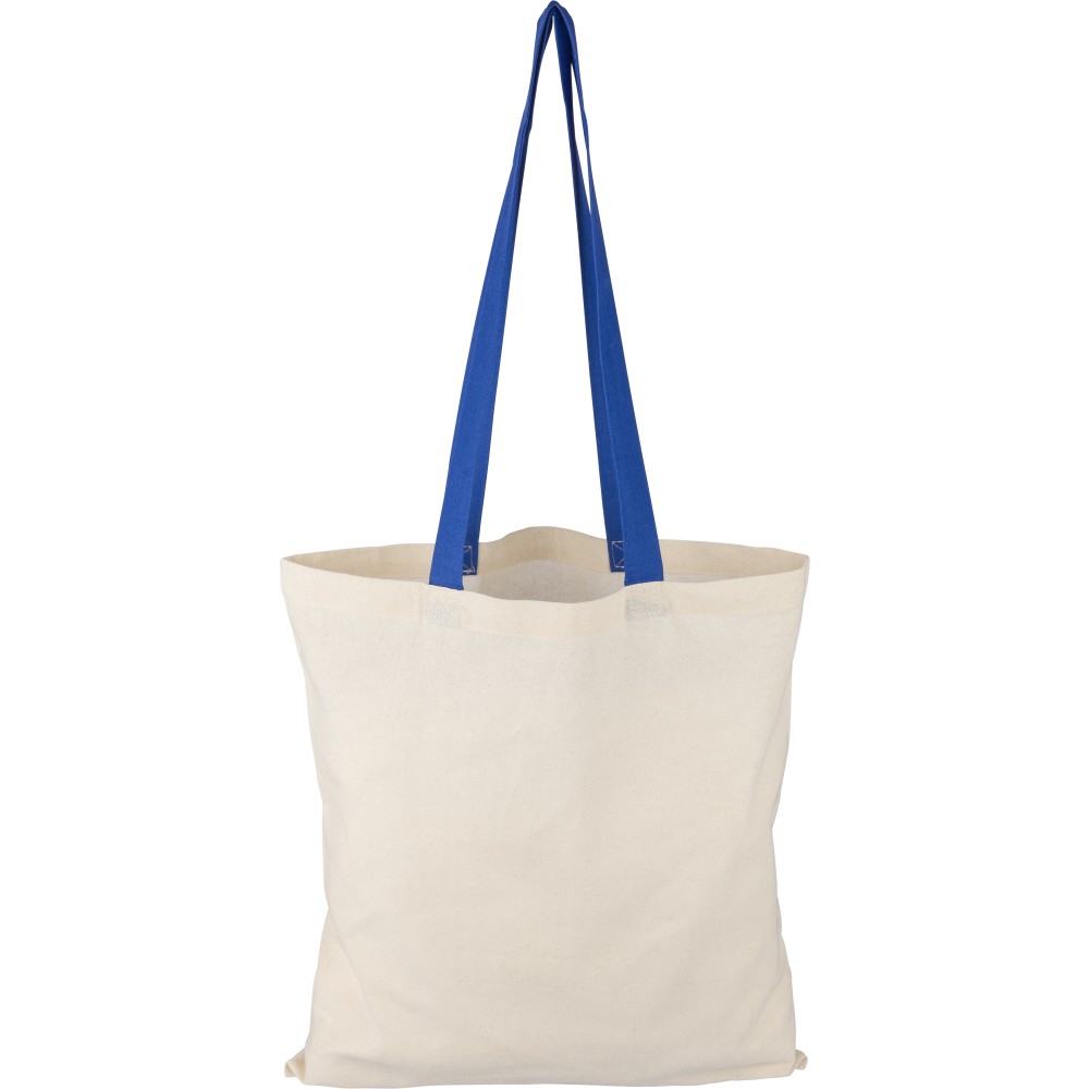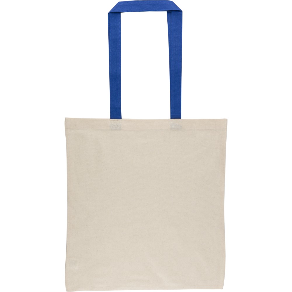 Oeko-Tex® cotton (140 gsm) shopping bag in natural color with colored handles. Size 38 × 42 cm with 70 cm long handles (2.5 cm width). Includes Oeko-Tex® label.