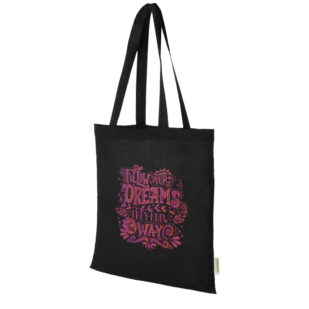 Tote bag made from 100% OCS certified 140 g/m2 organic cotton originating from India, featuring a large open main compartment providing plenty of space to carry around all of the essentials. The 32 cm long handles makes it comfortable and easy to carry around wherever you go. Resistance up to 5 kg weight. Volume capacity: 7 litres.