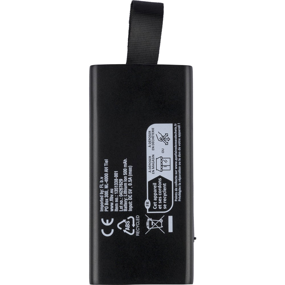 Recycled ABS 5W speaker with COB LED flashlight, silicone loop, and wireless tech 5.4. 500 mAh battery, 5V/500 mA input. Outdoor design with recycled logo. Packed in brown box.