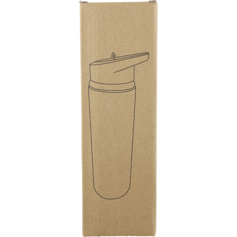 Recycled stainless steel drinking bottle (500 ml), single-walled with stainless steel 304, PP screw lid with carrying loop, foldable spout, and internal straw. Suitable for cold drinks only. Engraved recycled logo. Packed in a brown cardboard box.