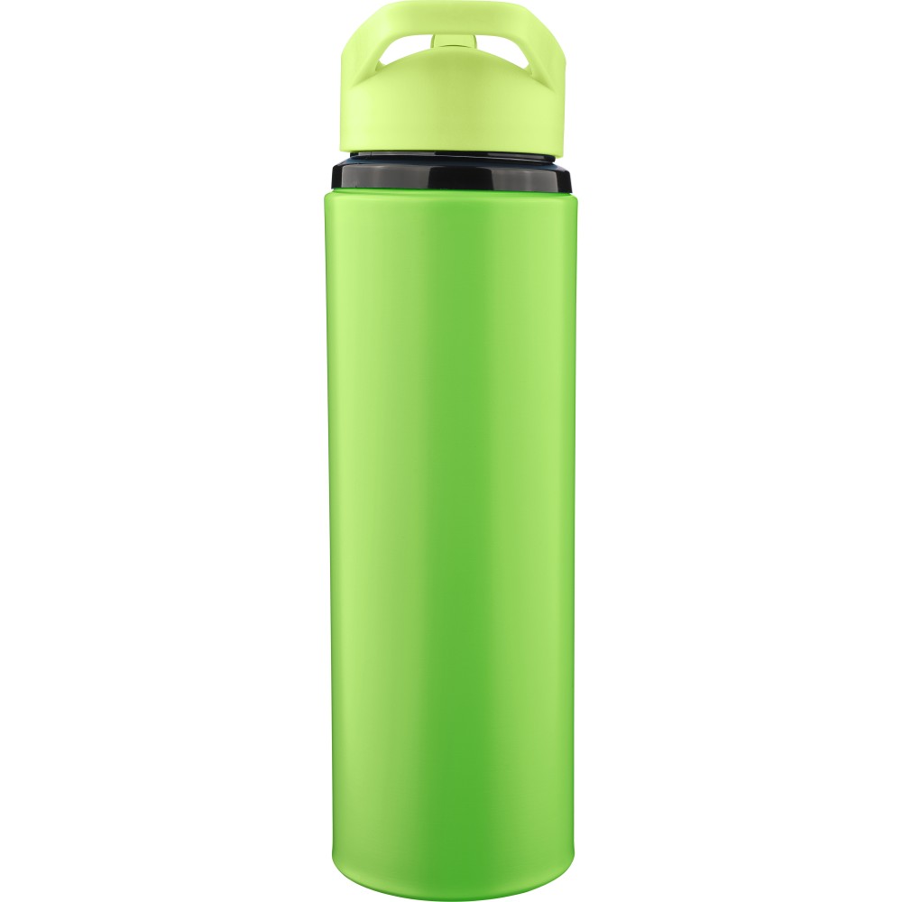 Recycled stainless steel drinking bottle (500 ml), single-walled with stainless steel 304, PP screw lid with carrying loop, foldable spout, and internal straw. Suitable for cold drinks only. Engraved recycled logo. Packed in a brown cardboard box.