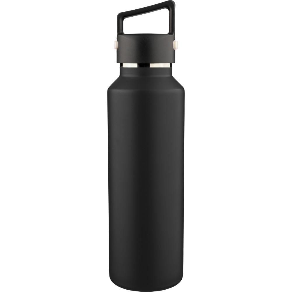 Recycled stainless steel vacuum bottle (600 ml) with double-wall construction, PP lid with carry loop, dual push-button lid opening, and laser-engraved recycled logo. Packed in a brown cardboard box.