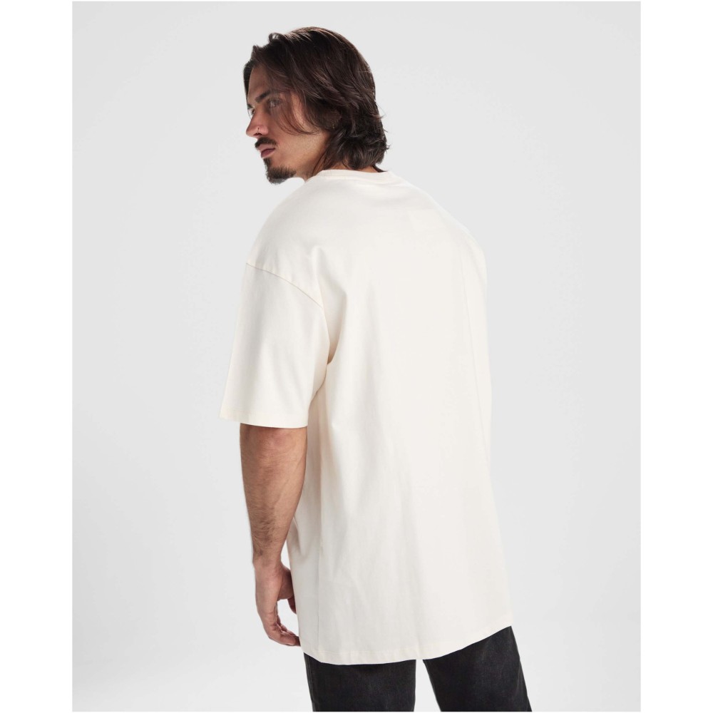 Oversized short sleeve t-shirt. Round collar trimmed in 2x1 rib with matching seam covers. Side seams. Wide double stitching on the sleeves and hem. Removable label.
