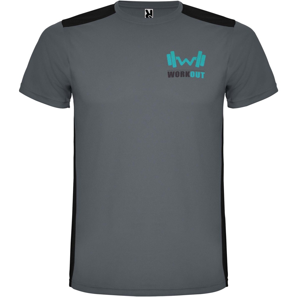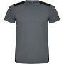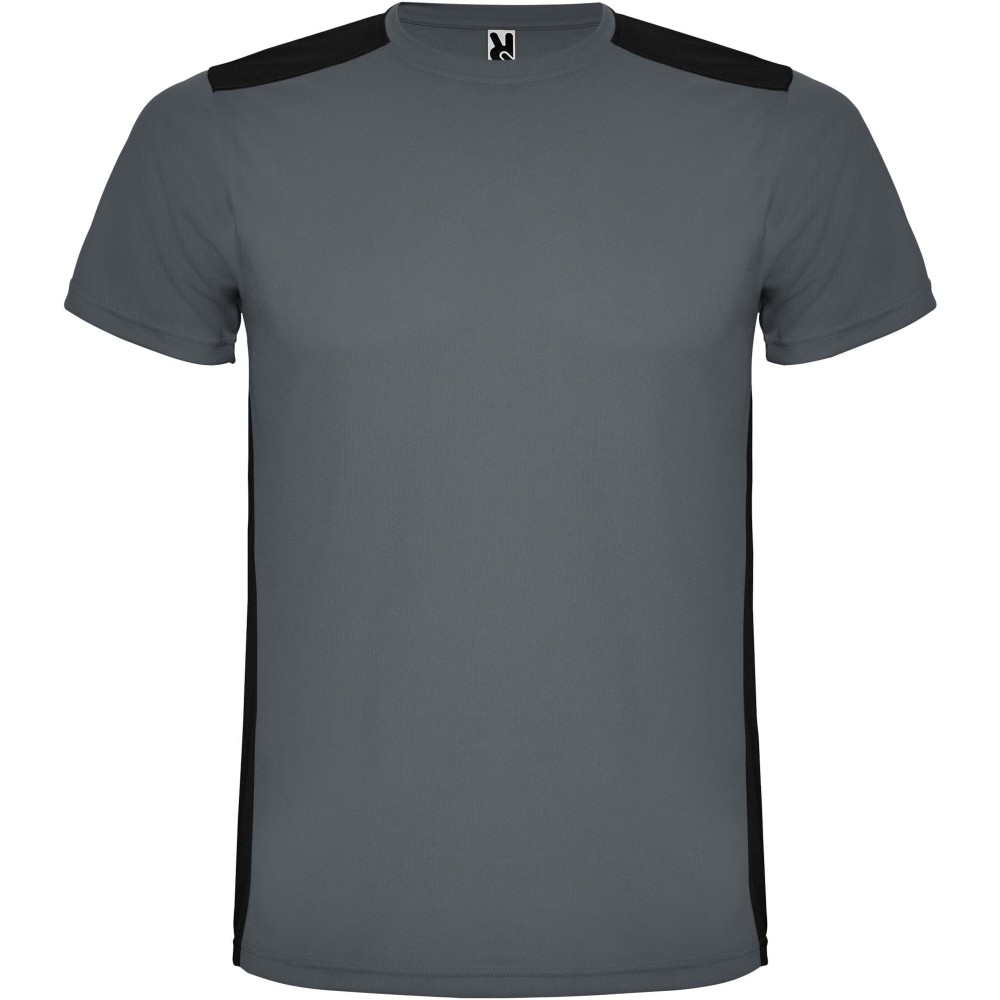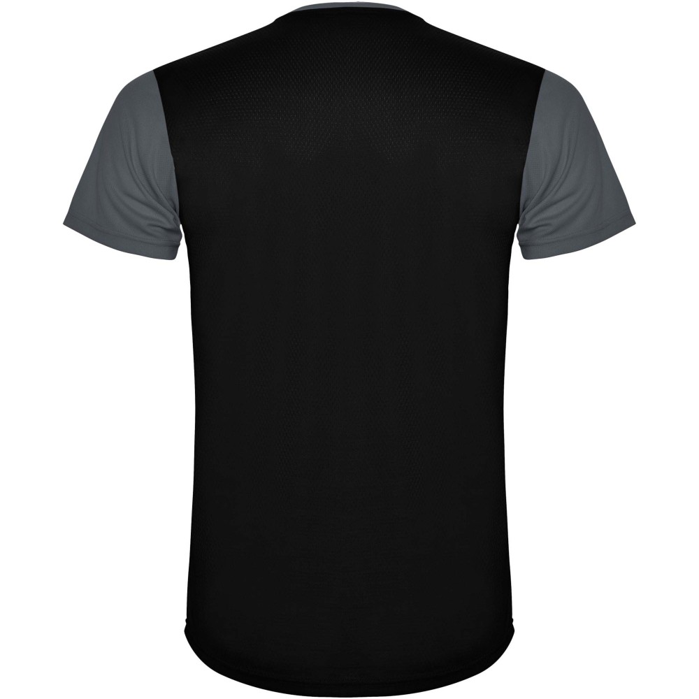 Easy-dry, technical and breathable fabric. Crew neck. Combination of two polyester fabrics on the back and shoulders. Bird's eye fabric on front and breathable 3D mesh fabric at the back. Fabric prepared for moisture absorption. Decorative zigzag backstitch on sides and shoulders. Back pattern slightly longer. Removable label.