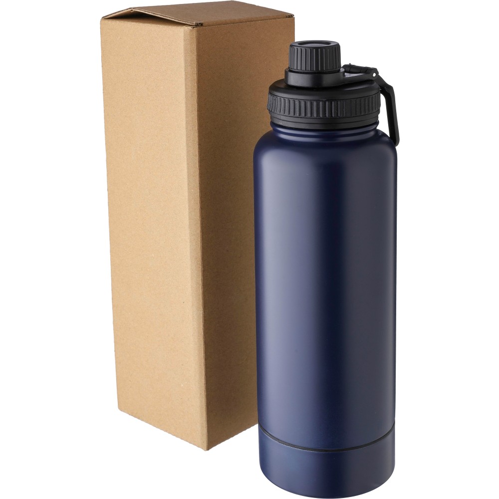Stainless steel double-walled drinking bottle (1000 ml). Features a PP lid with a screw dispenser and carrying loop. The bottom includes a small screw-on compartment for storage. The interior is made of stainless steel 304, and the exterior is stainless steel 201. Individually packaged in a brown cardboard box.