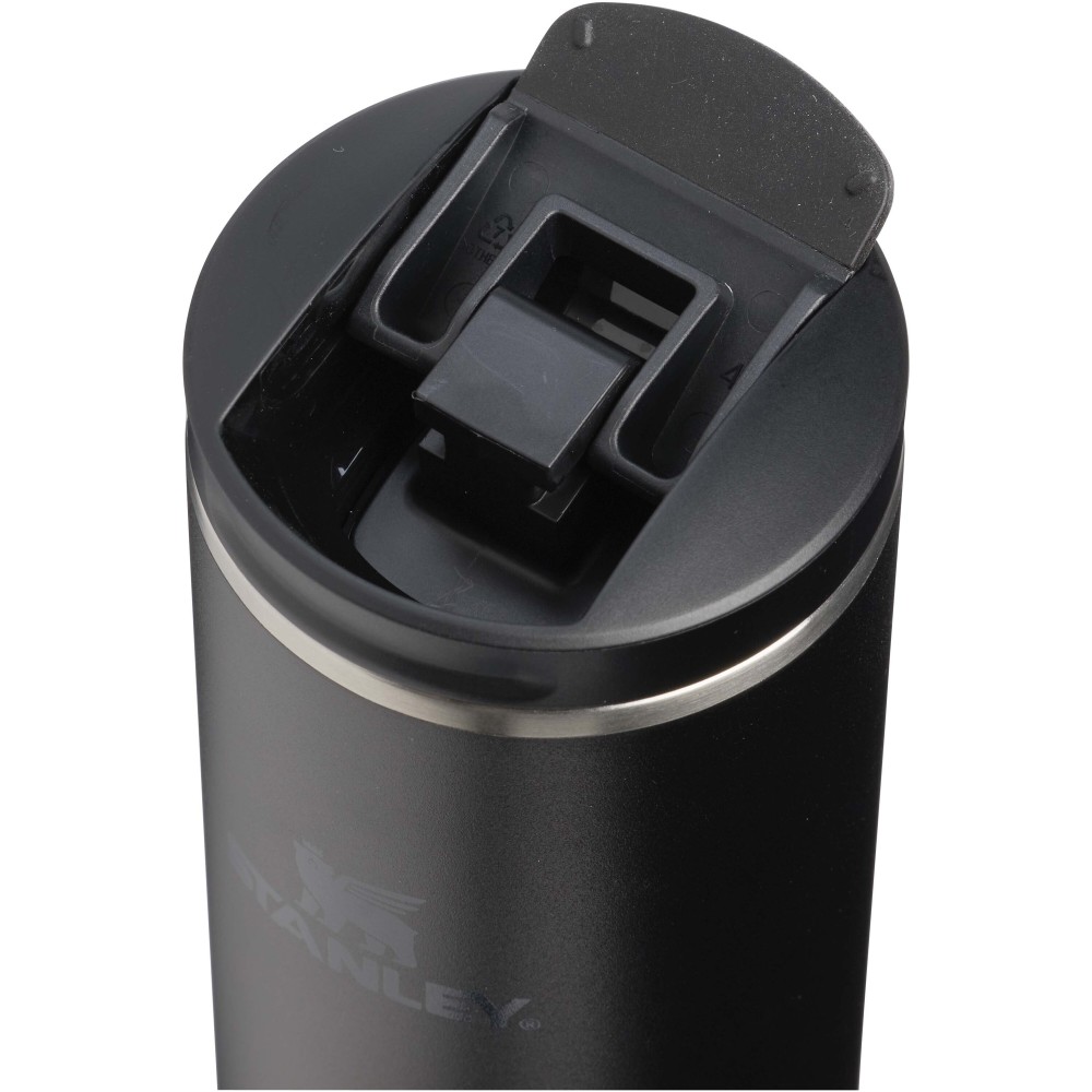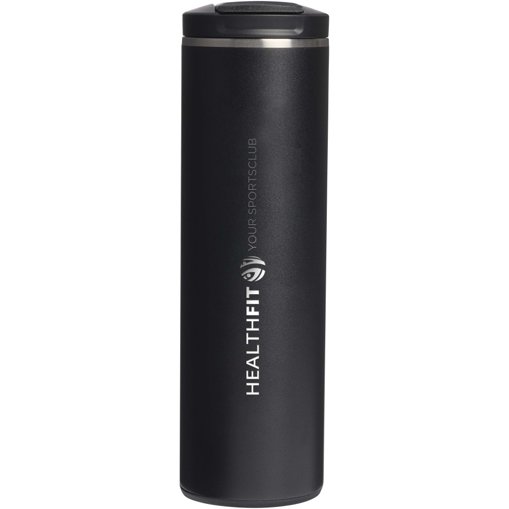 The 470 ml Transit Fliptop double-walled recycled stainless steel tumbler with vacuum insulation is made with premium technology that makes it 33% lighter than standard stainless steel. Featherweight spun-steel insulation keeps drinks hot for 4 hours or cold for 6 hours. The tumbler is leakproof and has a matching silicone at the lid tab and footpad which makes opening, closing and setting it down quieter. Dishwasher safe and compatible with most car cupholders.