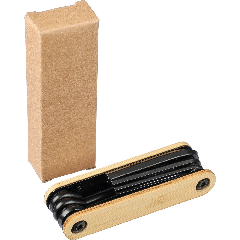 Carbon steel toolset with bamboo details. Includes 7 tools: Allen keys, Phillips screwdriver, and flathead screwdriver. Individually packaged in a brown cardboard box.