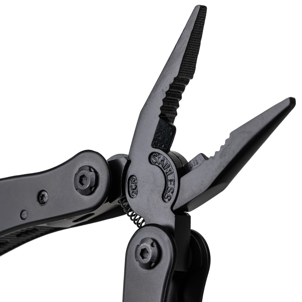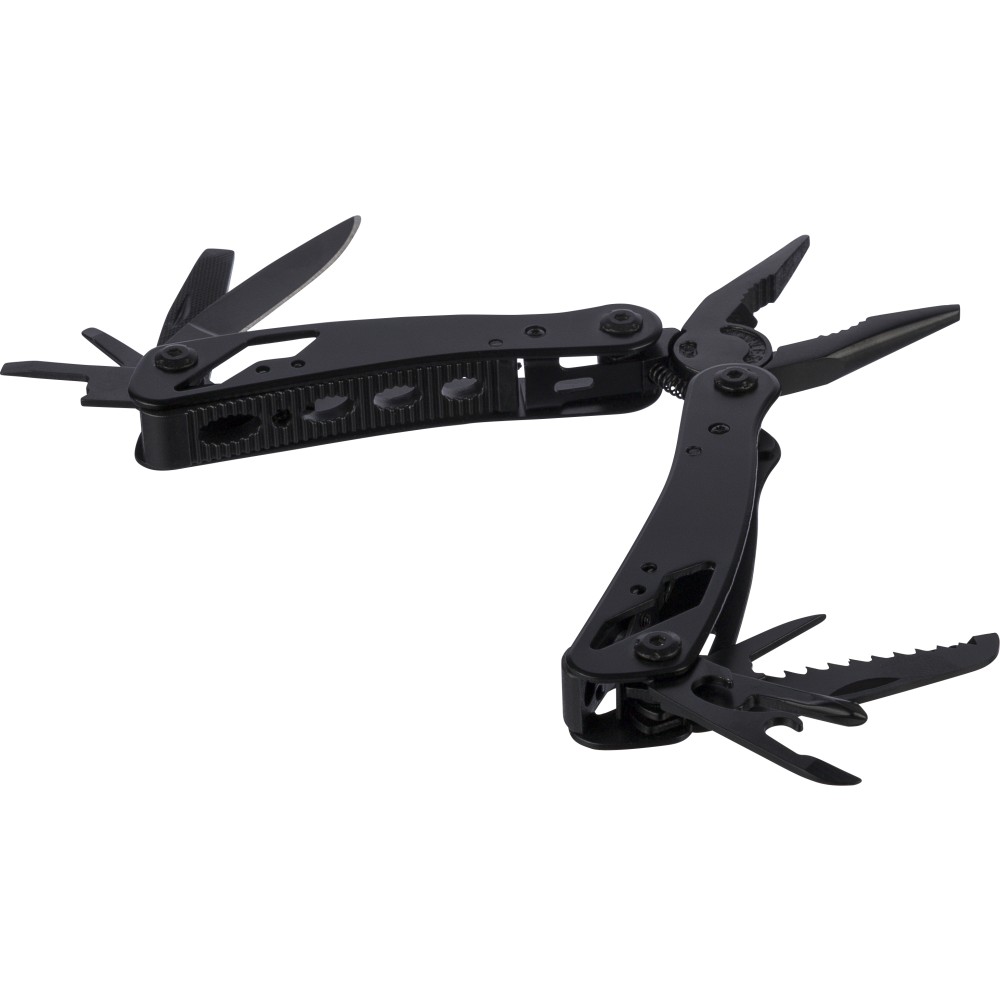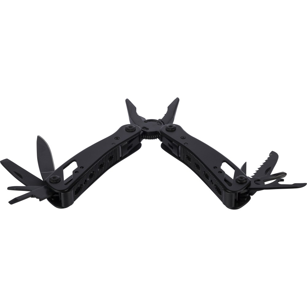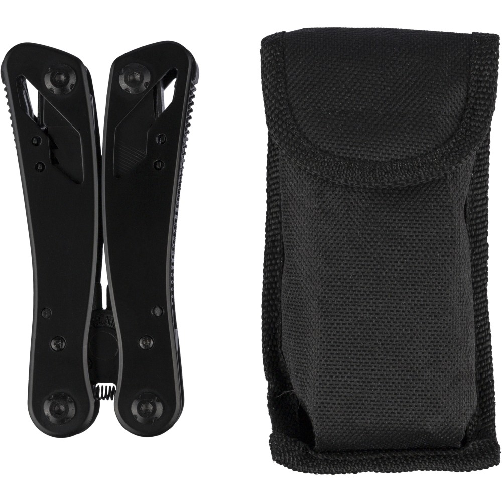 Black aluminium and stainless steel multitool with 13 functions including knives, screwdrivers, pliers, saw, file, lever, bits, spring, loop bar, can opener, and tang. Comes with a pouch featuring a velcro belt loop and additional outer box. Individually packaged in a brown cardboard box.