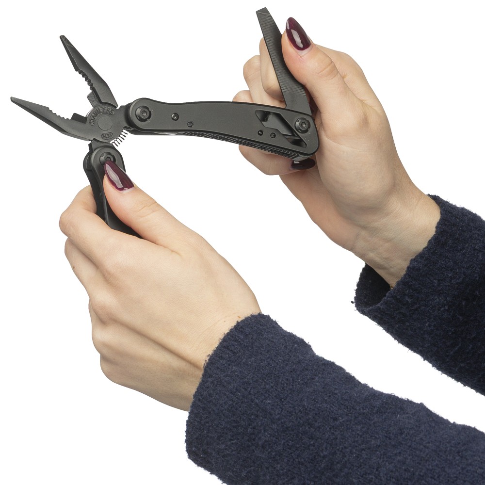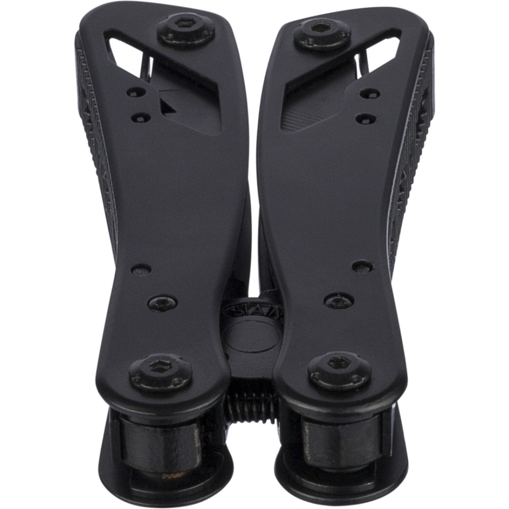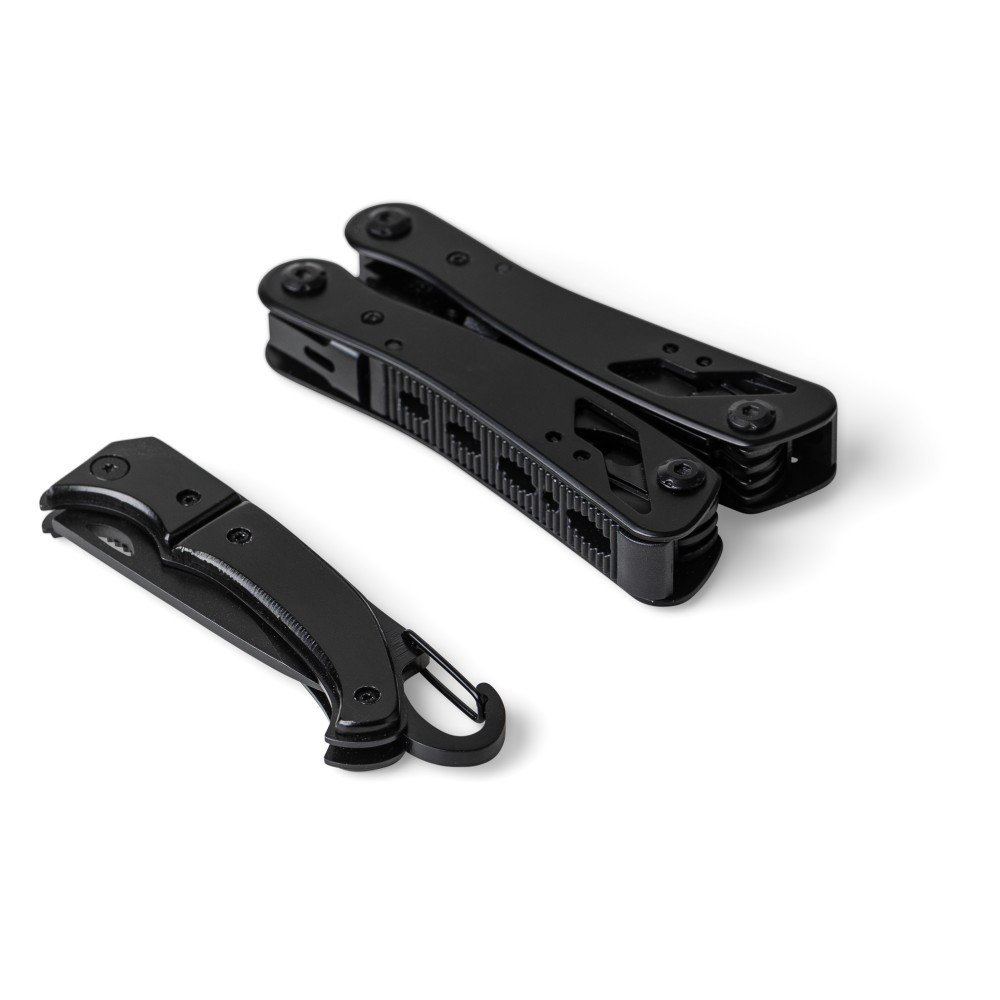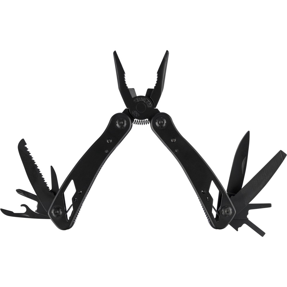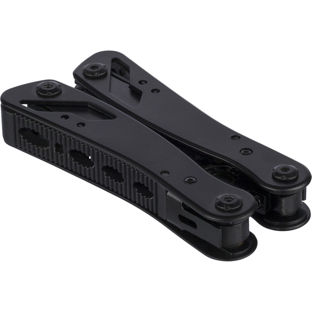 Black aluminium and stainless steel multitool with 13 functions including knives, screwdrivers, pliers, saw, file, lever, bits, spring, loop bar, can opener, and tang. Comes with a pouch featuring a velcro belt loop and additional outer box. Individually packaged in a brown cardboard box.