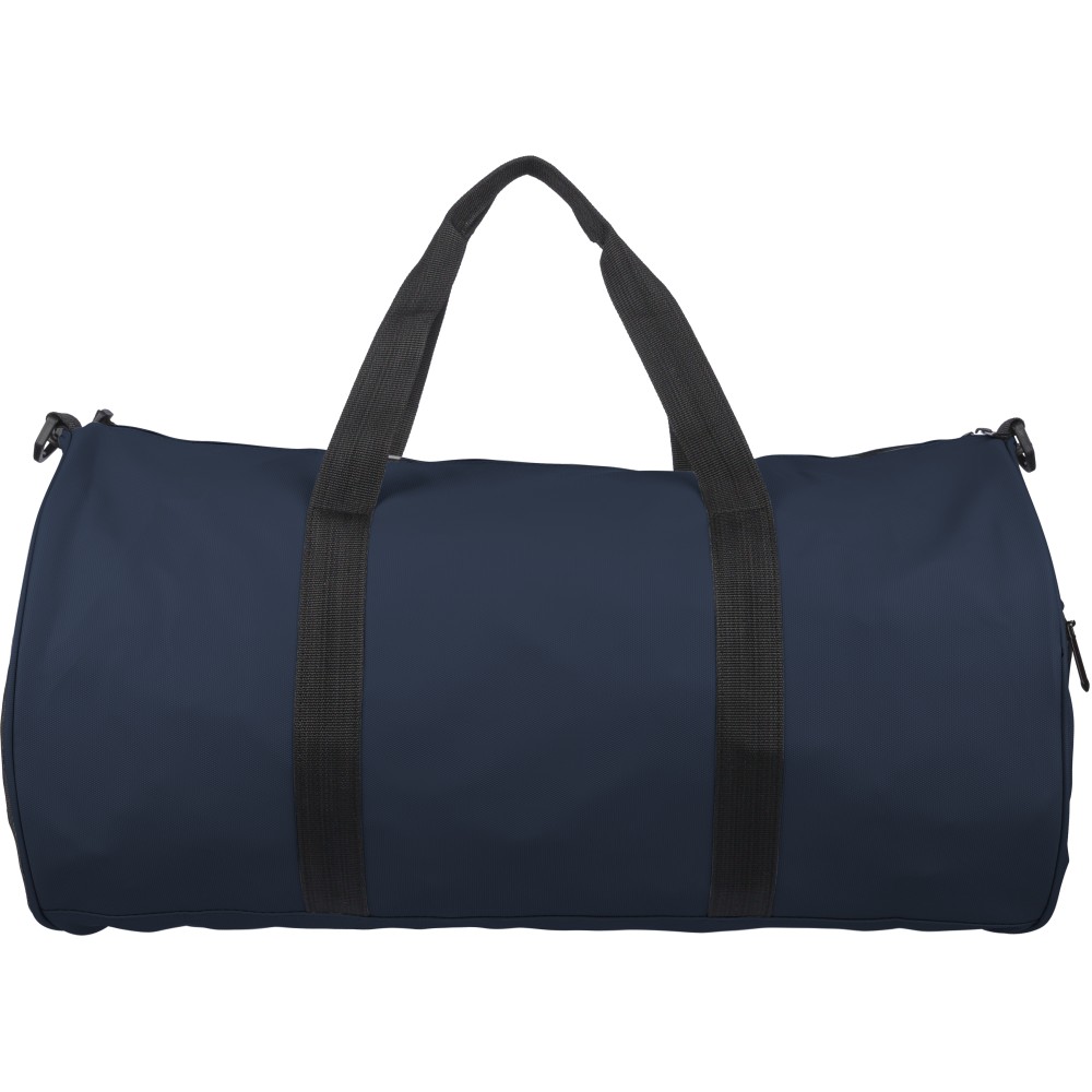 rPET duffle bag made from 600D polyester with 210D lining and water-repellent PU coating. Features a 40 l main compartment, front and side zippered pockets, mesh side pocket, two handles, and adjustable shoulder strap. Includes external rPET label.