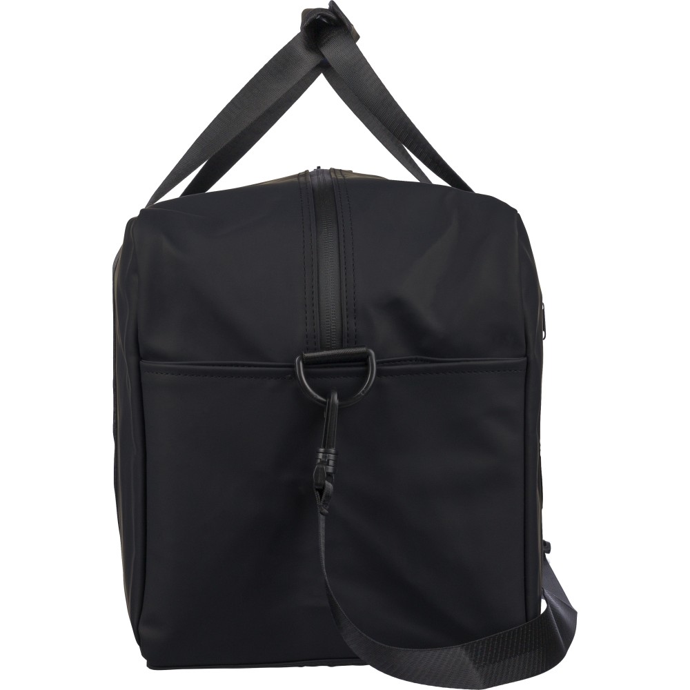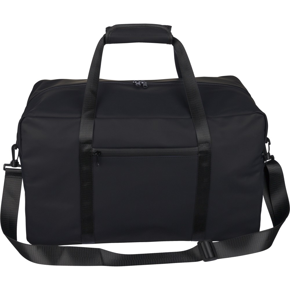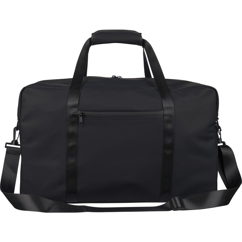 Recycled PU duffle bag (35 l) with 210D recycled polyester lining. Features 108 cm handles (2.5 cm wide) with velcro, 130 cm adjustable strap (3.9 cm wide), front zip pocket, and large main compartment. Recycled logo inside the label.