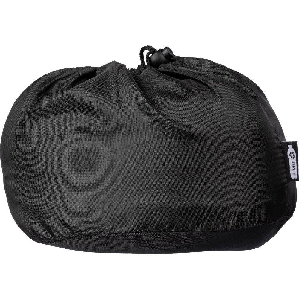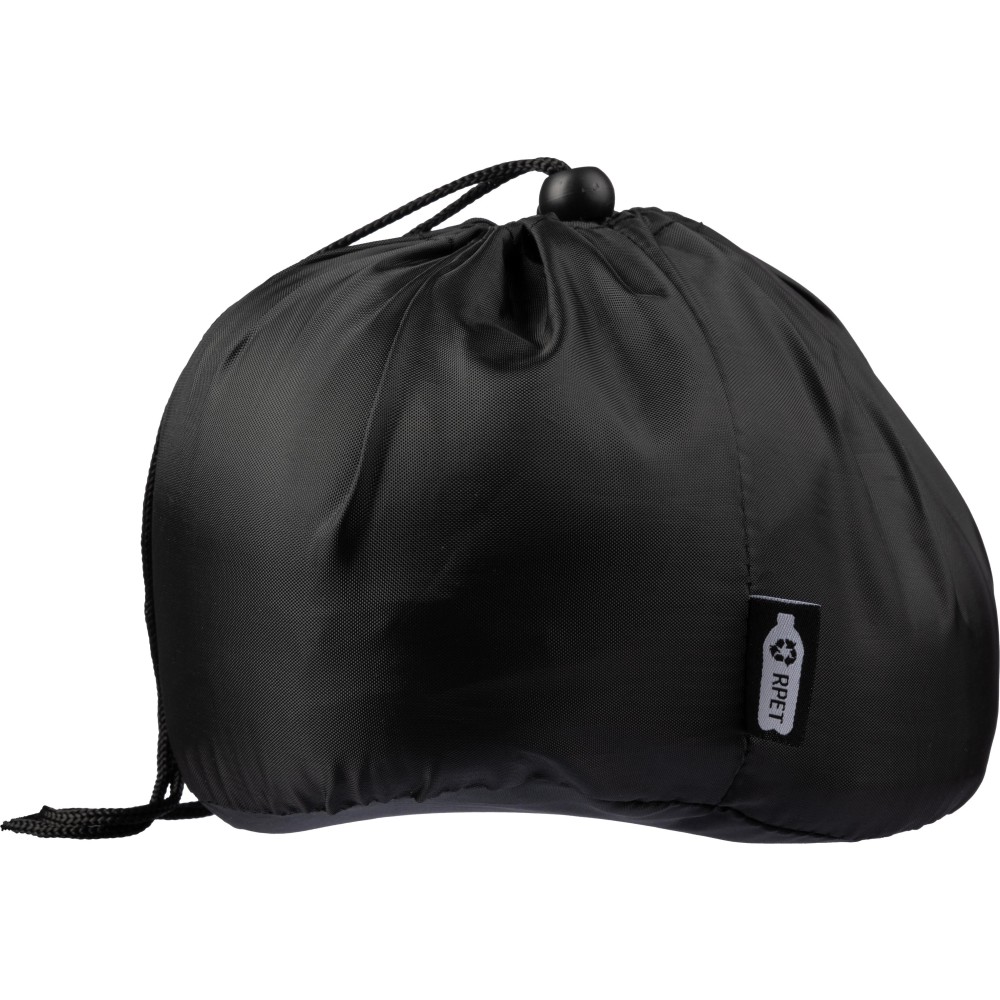 Memory foam travel pillow with adjustable cord. Packaged in an rPET pouch.