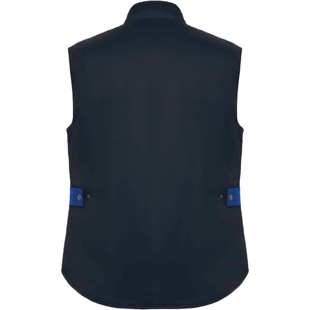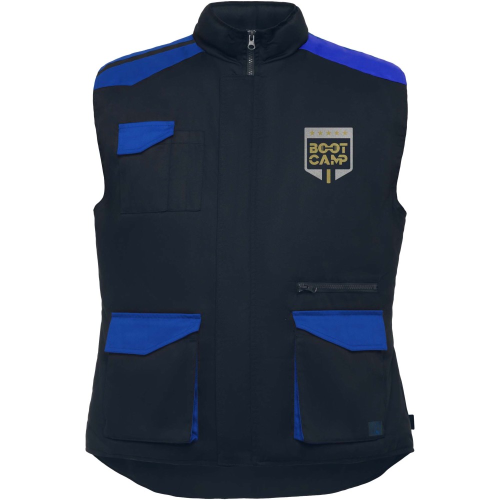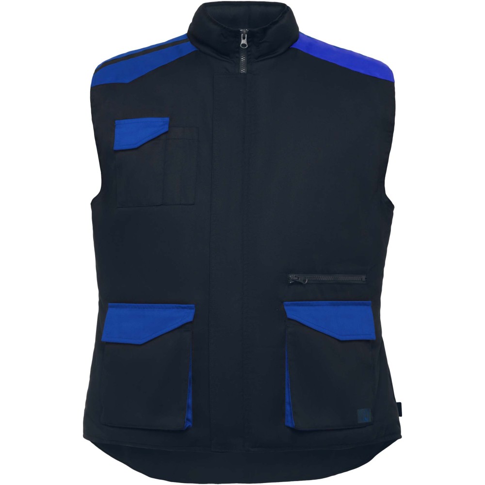 Multipocket work vest in two-colour combination, with high collar. Front zip with hook & loop fastening. Windbreakers in cuffs. Right side outer phone pocket with flap and hook & loop fastening. Two pleated front pockets with flap and hook & loop fastening. Two pen pockets. Inside pocket with hook & loop fastening. Zip pocket. Drop tail. Automatic adjuster. Contrasting shoulder pieces and details.