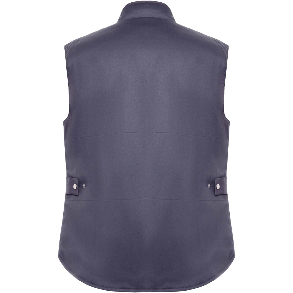 Multipocket work vest in two-colour combination, with high collar. Front zip with hook & loop fastening. Windbreakers in cuffs. Right side outer phone pocket with flap and hook & loop fastening. Two pleated front pockets with flap and hook & loop fastening. Two pen pockets. Inside pocket with hook & loop fastening. Zip pocket. Drop tail. Automatic adjuster. Contrasting shoulder pieces and details.