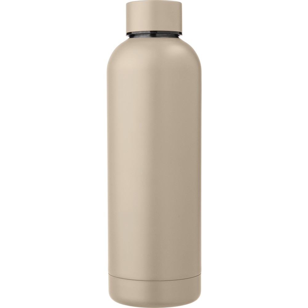 Recycled stainless steel (s/s304) bottle (500 ml) with a double wall and a matte finish. Individually packaged in a brown cardboard box.