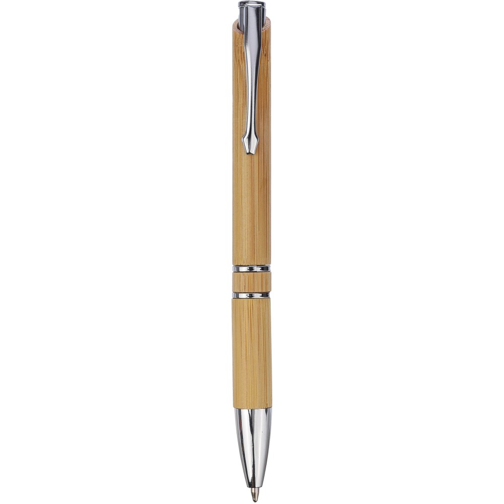 Bamboo ballpoint pen with chrome metal details and a push button. Rings, push button, and tip in plastic. Metal clip. Approx. 800 meters of writing length. Black ink.